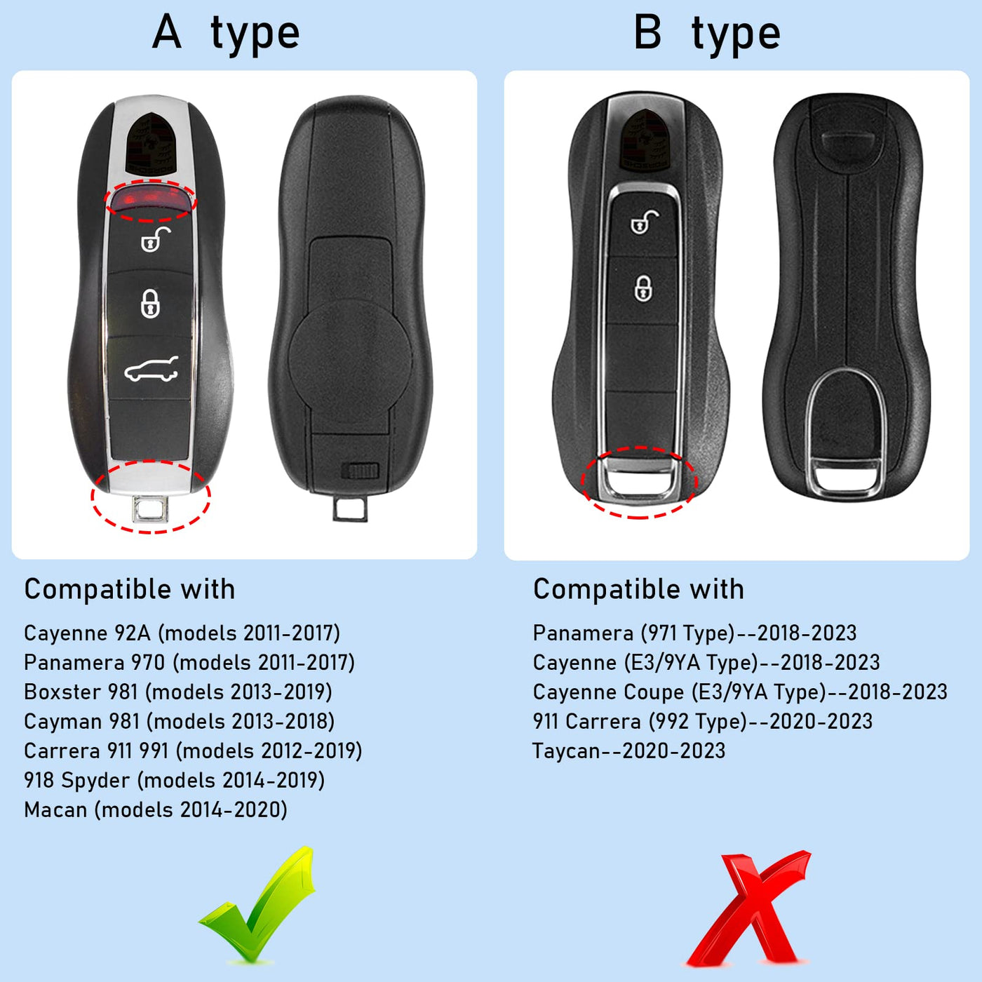 Compatible Vehicles Compatible With Cayenne Key Fob Cover: 92A (2011-2017) Compatible With Panamera Key Fob Cover: 970 (2011-2017) Compatible With Boxster Key Fob Cover: 981 (2013-2019) Compatible With Cayman Key Fob Cover: 981 (2013-2018) Compatible With Carrera Key Fob Cover: 911 991 (2012-2019) Compatible With 918 Spyder Key Cover (2014-2019) Compatible With Macan Key Fob Cover (2014-2020)