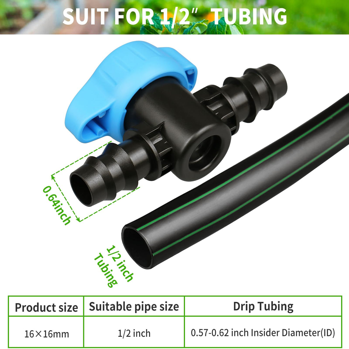 These 17mm irrigation fittings work with most of 1/2' Drip irrigation tubing (17mm .560-.600' ID), compatible with Rainbird, Orbit, Dig and Toro half inch tubing. Package includes 10 pieces barbed Couplings, 8 Tees, 6 Elbows, 2 Cross connector, 2 drip valve and 6 Tubing End Closure. Couplings, 6 Tees, 6 Elbows, 2 Cross connectors, 2 drip valve and 6 Tubing End Closure.