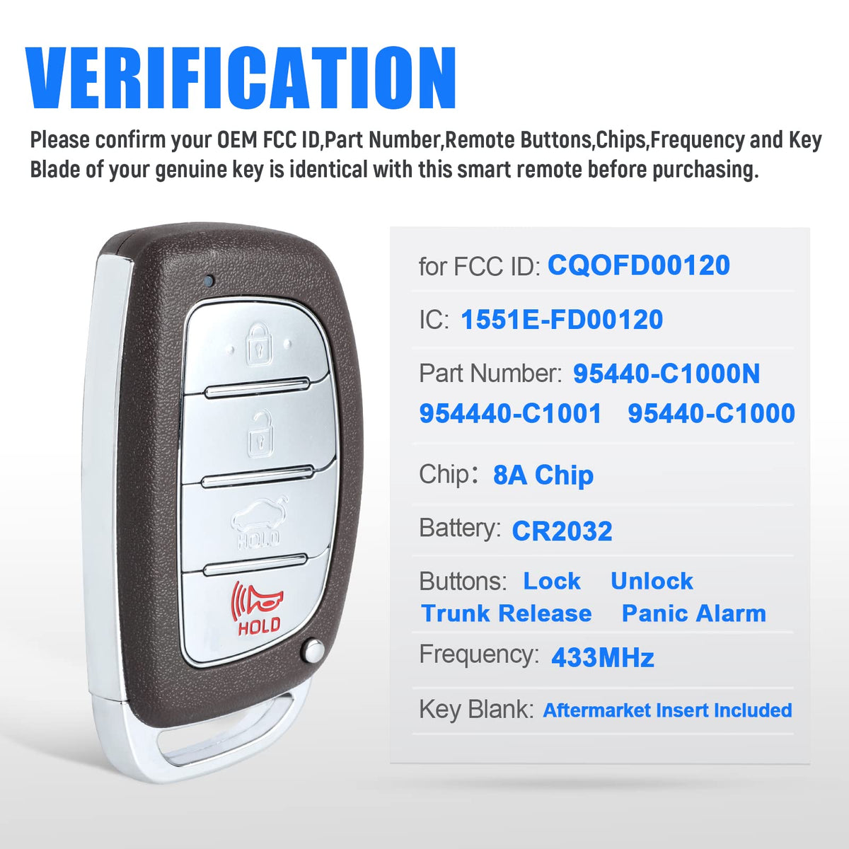 Q: Is this key fob compatible with my 2015 Hyundai Sonata?A: Yes, this Keymall Keyless Entry Remote Key Fob is specifically designed for compatibility with Hyundai Sonata models from 2015 to 2017. However, it’s essential to verify your vehicle's FCC ID or OEM Part Number to ensure a proper match.
