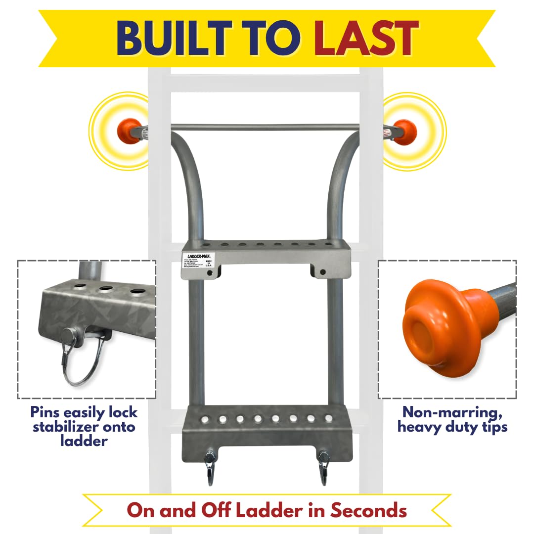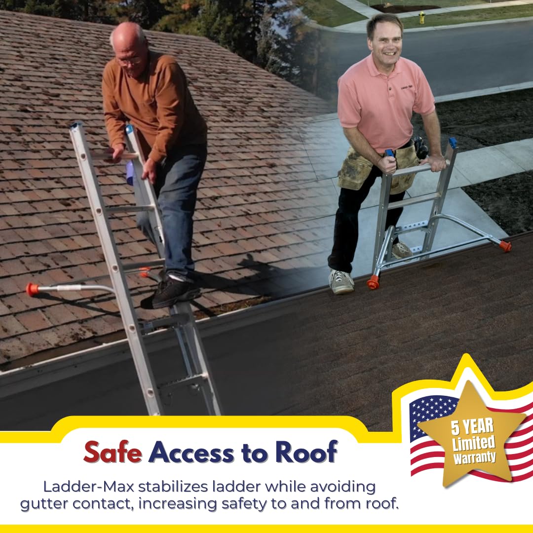 The super sturdy Ladder-Max is professional grade AND homeowner friendly. It provides 19" of standoff from gutters, roofing and walls while stabilizing your ladder with arms that reach 36" from tip to tip. Our signature orange tips are made in the USA from non-marring heavy-duty plastic and provide four points of stable contact to protect you from sideslip and to protect the surface on which your Ladder-Max standoff rests. The standoff distance also allows you to work in a natural, unstrained position. You're able to reach farther more safely. The Ladder-Max standoff is constructed in the USA of rugged, durable, rust-resistant steel and is built to last. It has the highest duty rating for type 1AA ladders with a special duty rating of #375.
