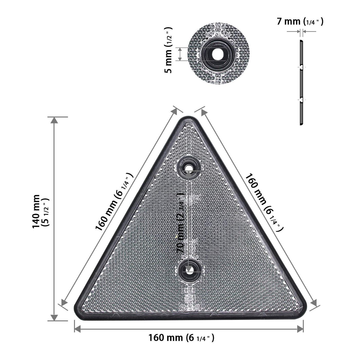 Q: What are the dimensions of the MFC PRO Tail Rear Back Marker Indicator Triangle Reflectors?A: The MFC PRO Triangle Reflectors measure 160x160x160mm (6.29 x 6.29 x 6.29 inches) with a height of 140mm (5.51 inches).