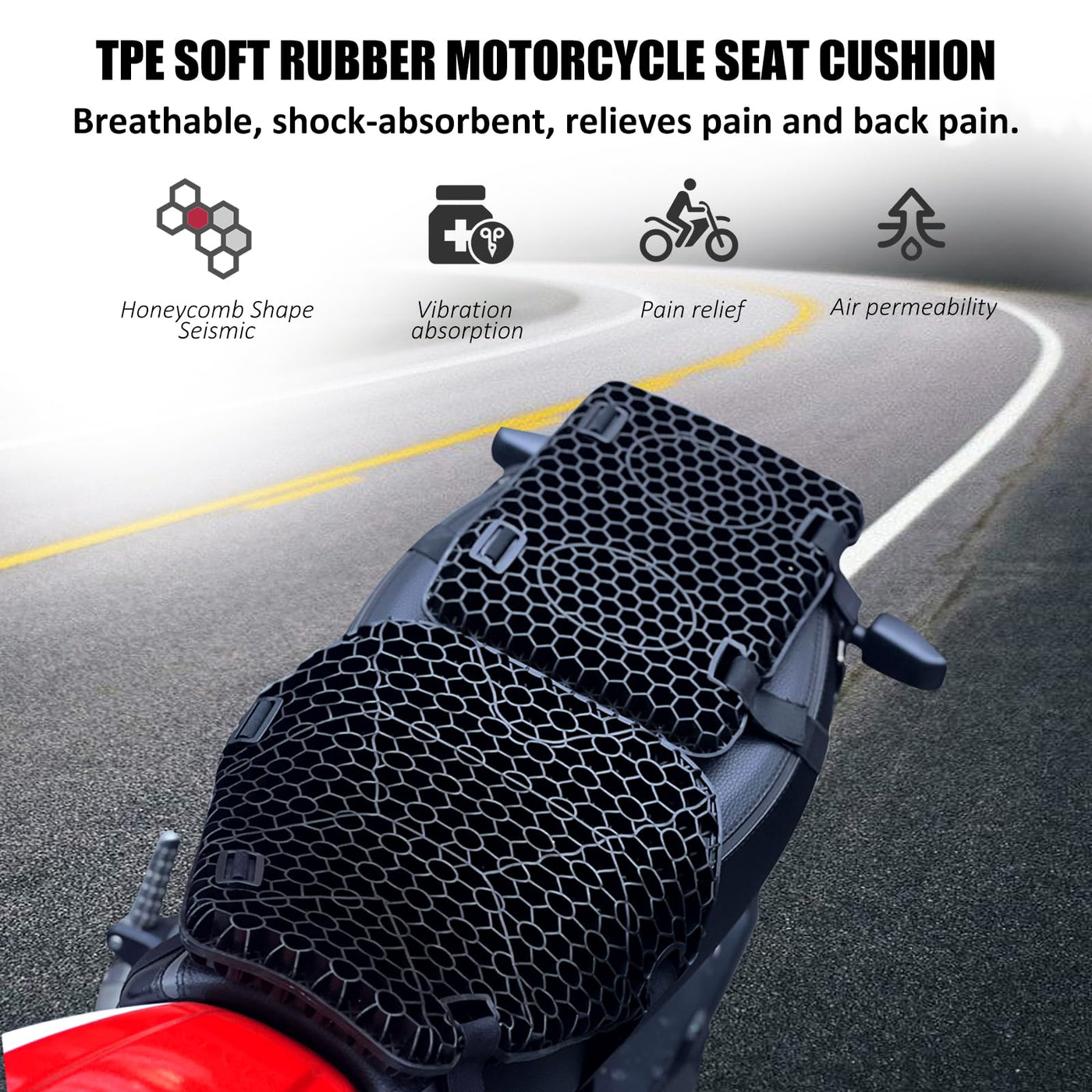 Motorcycle seat cushion jelly gel material 3D honeycomb shock-absorbing seat cushion with motorcycle seat cover can be used in various places such as home, chair, office, driving seat, wheelchair, dining chair, etc. Recommended for daily work or long-distance driving, suitable for family, one's day, birthday gift. Product Name: Motorcycle Seat Cushion. Product material: TPE soft rubber. Product Weight: 51 oz. Product style: minimalism. Product Dimensions: 14.5 x 14.1x1.5 inches. Product Quantity: 1x Motorcycle Seat Pad (Front Pad + Rear Pad). Features: 1. Honeycomb design, composed of thousands of air columns, brings comfort to your buttocks that is different from memory foam seat cushions. 2. The motorcycle seat cushion has good cushioning and impact resistance. Better reduce pressure points, improve circulation, reduce shock and vibration.