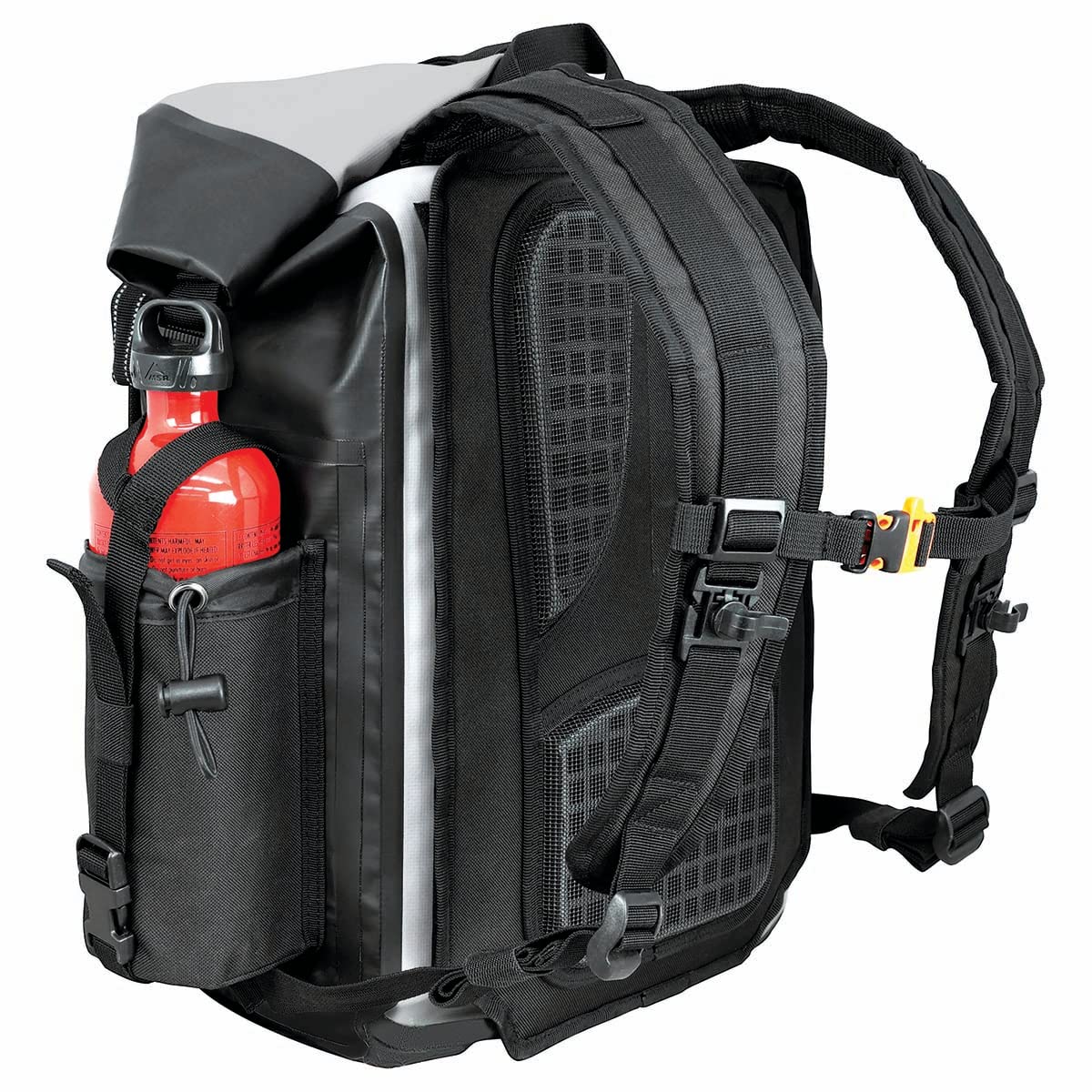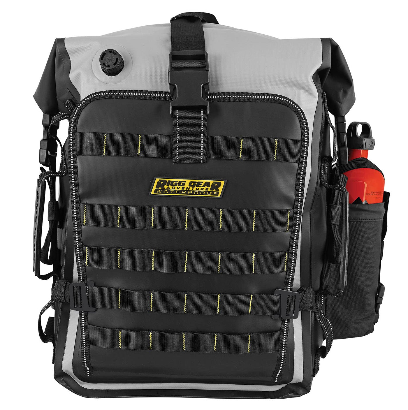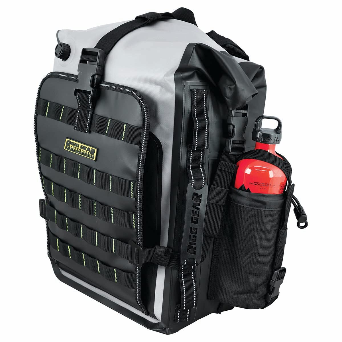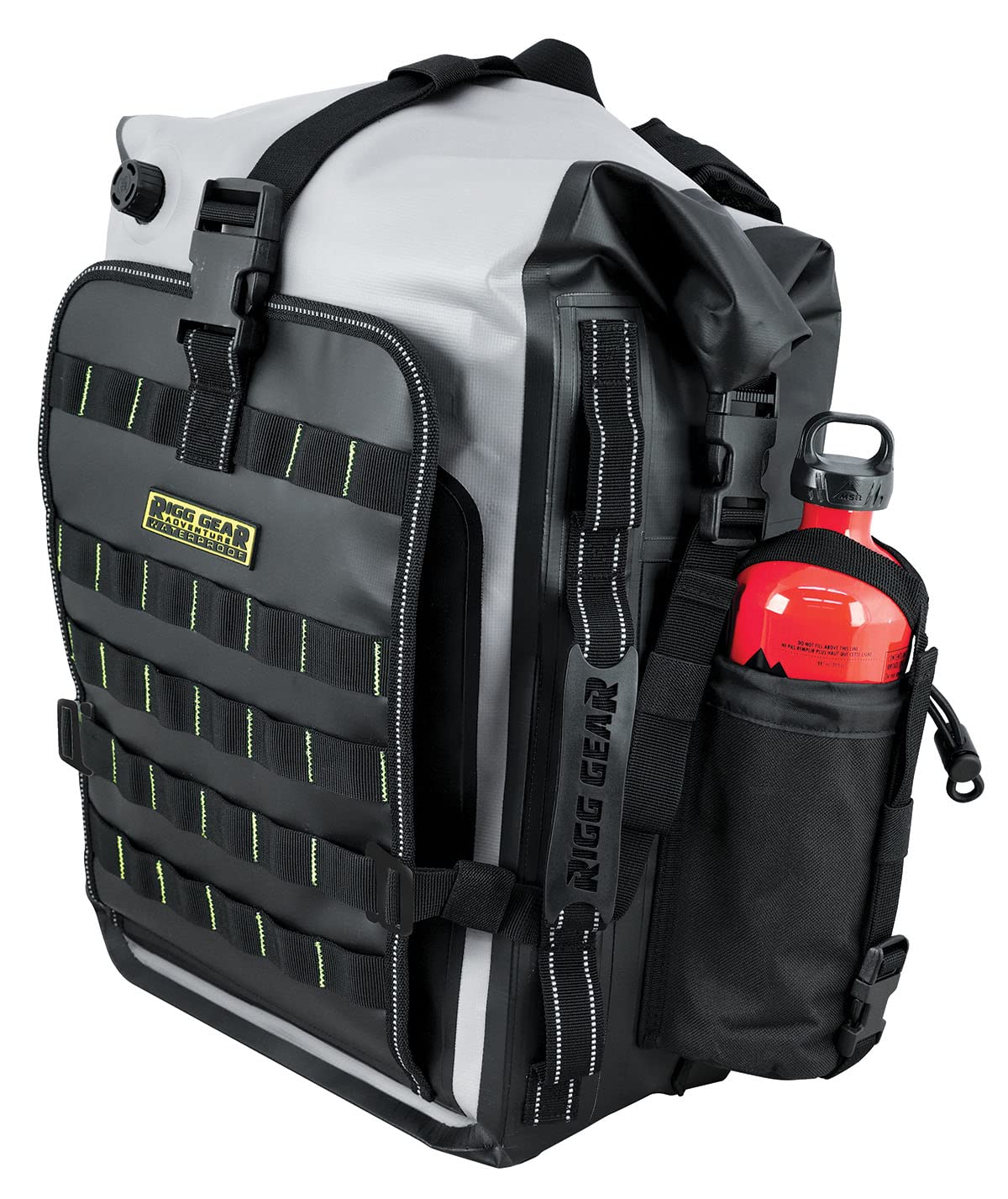 LIFETIME WARRANTY 100% waterproof backpack. All seams are electronically heat welded. Made from waterproof and durable PVC Tarpaulin. Watertight roll closure with quick release buckles. Outer material cleans easily and prevents slipping or marking. Securely mounts using patented RIGG STRAPS system. RIGG STRAPS can also be used as a separate tie down system. Padded back panel is sectionalized to allow for better air flow. Back panel pad opens to conceals backpack straps when using as a tail pack. Dual quick release closure either over the top or down the sides. Purge valve makes for easy compression. Inner loops for attaching smaller items for quick access. Front MOLLE panel includes a clear waterproof document pocket. Integrated external pocket to hold optional hydration bladder (CL-HYDRO-S not included). Side bottle pocket large enough to hold 30 oz. fuel bottles (Bottles not included). Side MOLLE panel to add other optional accessories. Backpack straps are adjustable and padded for comfort. Dimensions: 12.5”L x 7”W x 21.5”H Hold approx. 30 liters