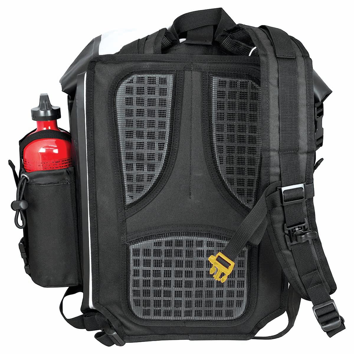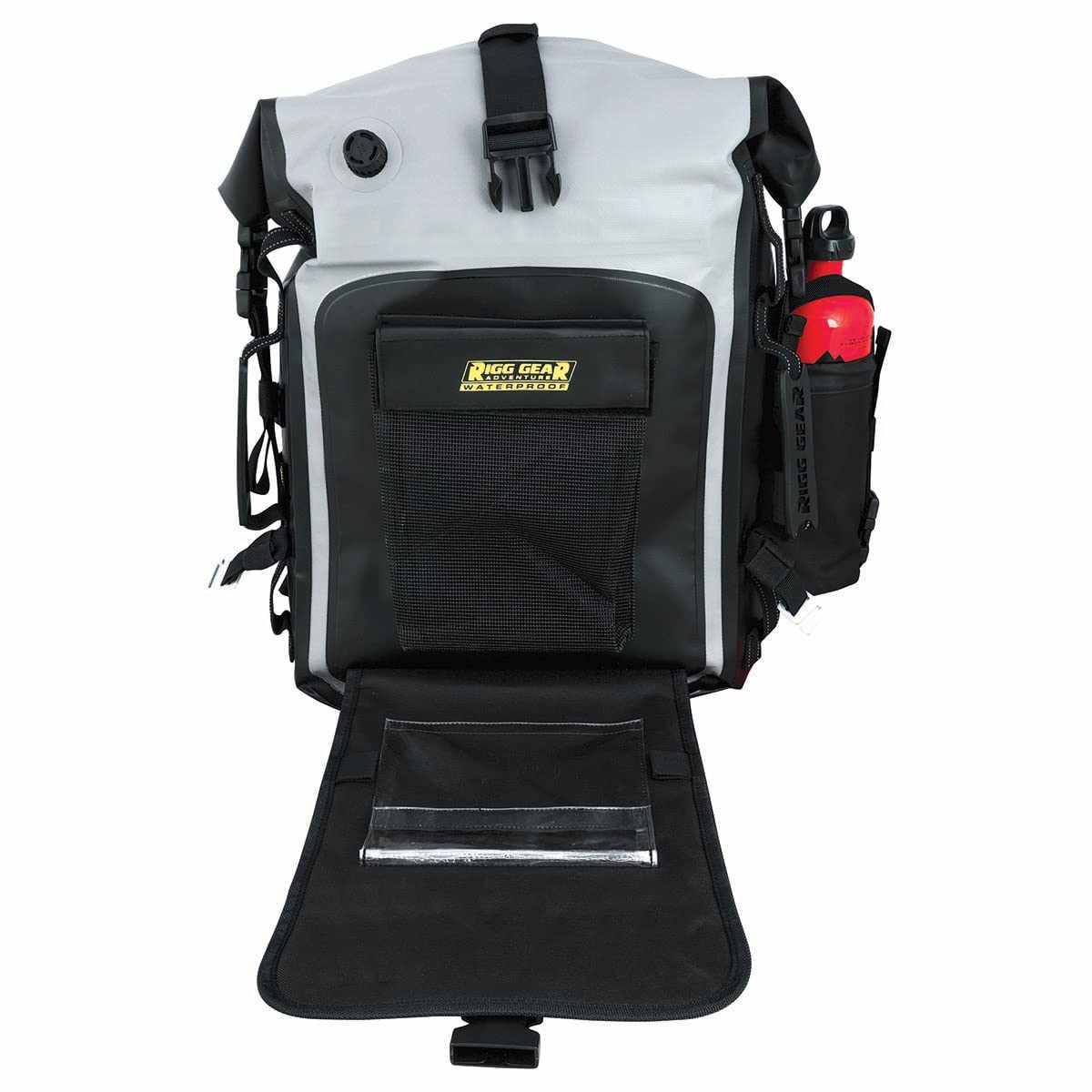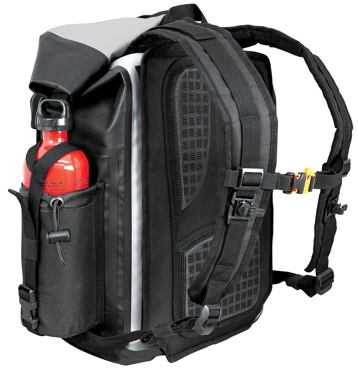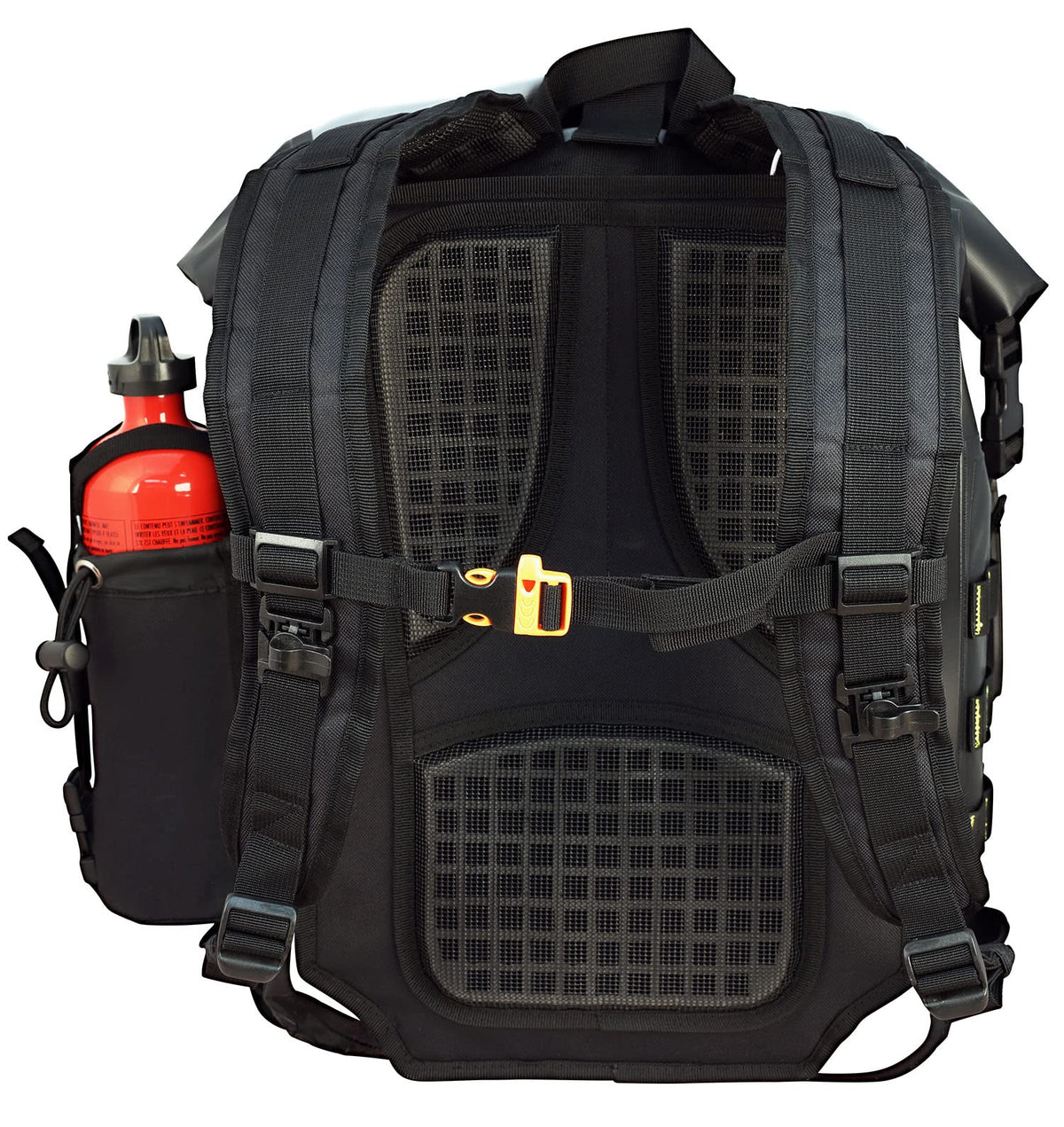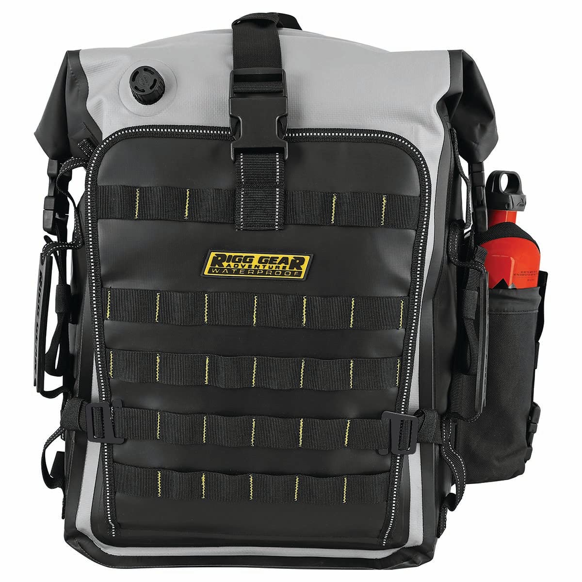 LIFETIME WARRANTY 100% waterproof backpack. All seams are electronically heat welded. Made from waterproof and durable PVC Tarpaulin. Watertight roll closure with quick release buckles. Outer material cleans easily and prevents slipping or marking. Securely mounts using patented RIGG STRAPS system. RIGG STRAPS can also be used as a separate tie down system. Padded back panel is sectionalized to allow for better air flow. Back panel pad opens to conceals backpack straps when using as a tail pack. Dual quick release closure either over the top or down the sides. Purge valve makes for easy compression. Inner loops for attaching smaller items for quick access. Front MOLLE panel includes a clear waterproof document pocket. Integrated external pocket to hold optional hydration bladder (CL-HYDRO-S not included). Side bottle pocket large enough to hold 30 oz. fuel bottles (Bottles not included). Side MOLLE panel to add other optional accessories. Backpack straps are adjustable and padded for comfort. Dimensions: 12.5”L x 7”W x 21.5”H Hold approx. 30 liters