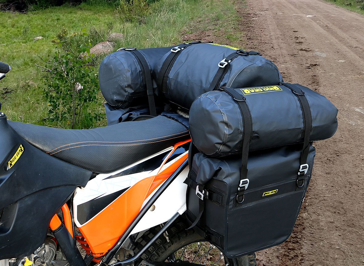 Q: What type of motorcycle racks are compatible with these saddlebags?A: These saddlebags can mount to most adventure and dual sport motorcycle racks. They are designed to securely attach using 4 quick release cam buckles and double pull straps.