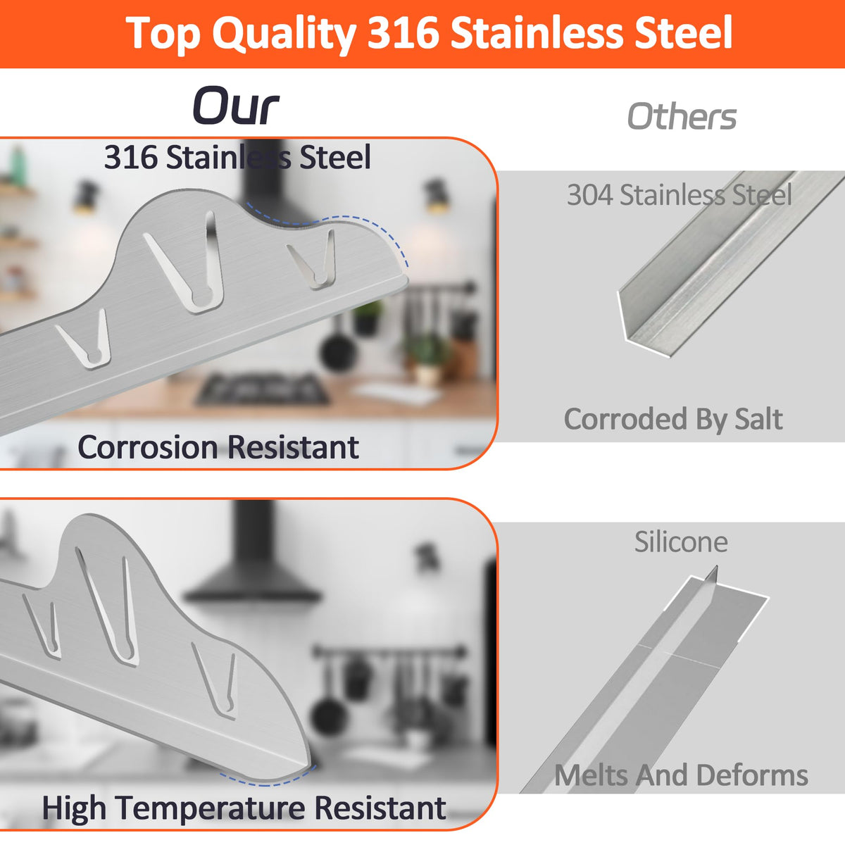 Q: What makes these gap covers better than silicone options?A: The NISHCON stove gap covers are made from 316 stainless steel, which won’t melt like silicone or corrode from salt like 304 steel. They provide greater durability and resistance to high temperatures.