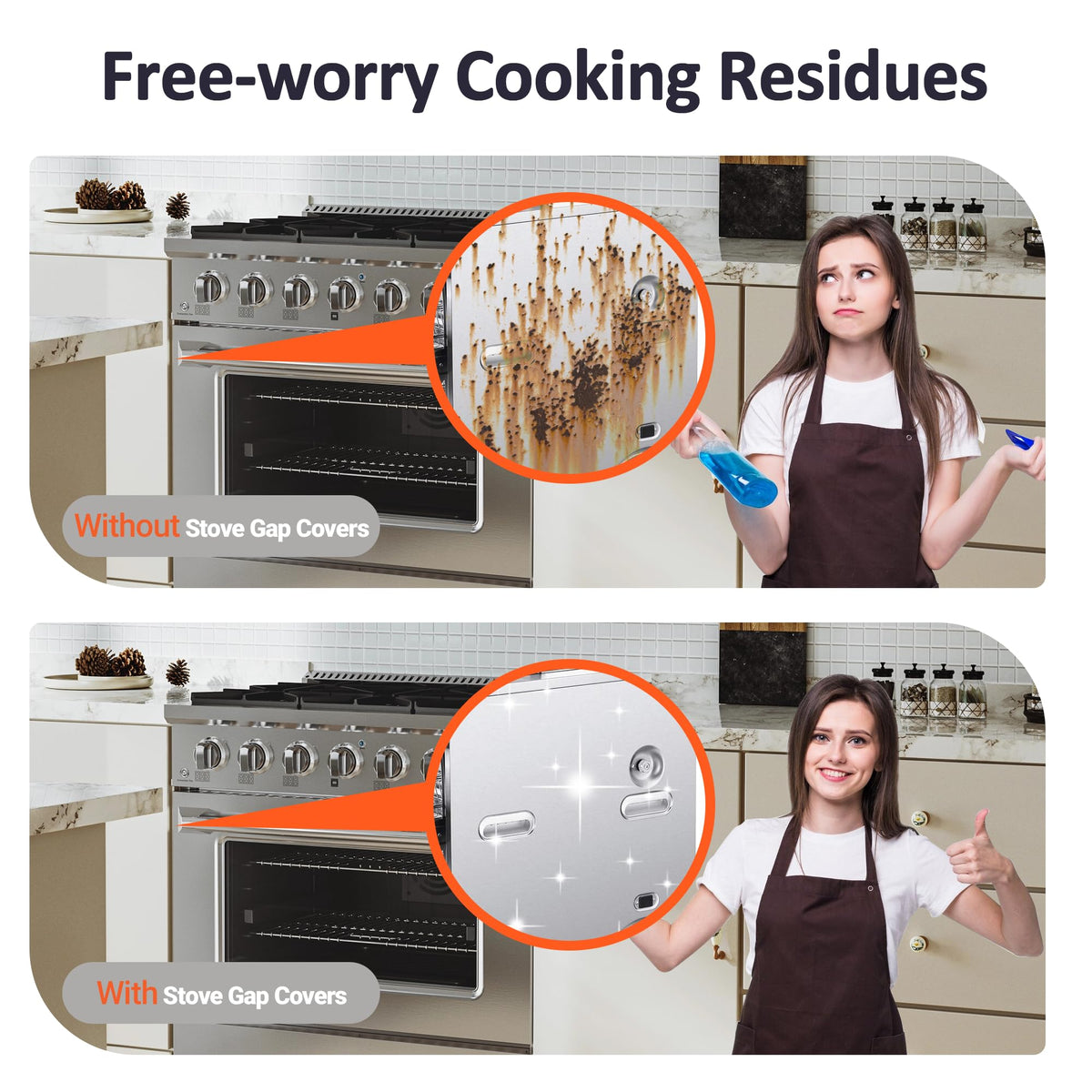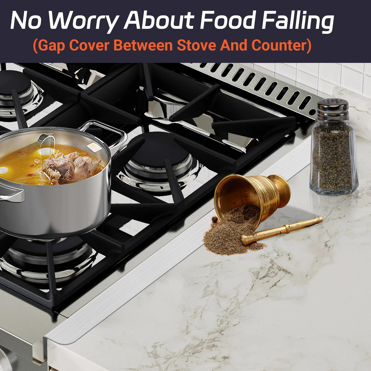 PLEASE NOTE: This kitchen stove counter gap covers feature a unique telescoping design that allows you to easily adjust the size of the gap fillers, the length can be adjusted as needed from 23.6' - 47.2' to fit your stovetop gap, and the gap width of these gap covers can be up to 0.94'.STABILIZING NON-SLIP ADJUSTABLE DESIGN: The stove guard kit includes two stove gap covers, each with a unique proprietary 3 spring design that prevents them from sliding and moving while you are cooking or cleaning, and they are also very easy to remove when needed. Even during intense cooking sessions, our stainless steel crevice covers stay firmly in place, keeping the cooking area safe and clean!PREMIUM 316 STAINLESS STEEL CONSTRUCTION: Stove gap covers stainless steel are made from premium 316 stainless steel, known for its superior corrosion and heat resistance. This ensures unrivaled durability and strength to last even in the harshest kitchen conditions.Our stainless steel stove gap cover is a great alternative to silicone.EASY INSTALLATION: Our universal stove gap cover fits perfectly on all stoves and ovens. Installation is simple - simply peel off the protective film from the stainless steel stovetop gap cover and push it into the gap on the side of the oven. No tools or hardware are required. Please make sure that the length of our stove gap cover (23.6 inches) fits your stovetop gap and does not extend beyond the edge of the cabinet.SLEEK & STYLISH: Brushed finish matches your kitchen stove and other kitchen appliances. Stove gap cover's streamlined design and metallic sheen blends perfectly with any kitchen style, brings practical benefits while enhancing the overall aesthetics, and is very easy to clean, food residue comes off with a wipe.