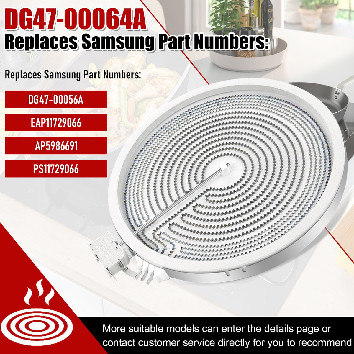 Q: What are the compatibility details for the DG47-00064A surface element?A: The DG47-00064A surface element is compatible with Samsung stove ranges and can replace models DG47-00056A, EAP11729066, AP5986691, and PS11729066. It is designed to fit seamlessly into your existing setup.