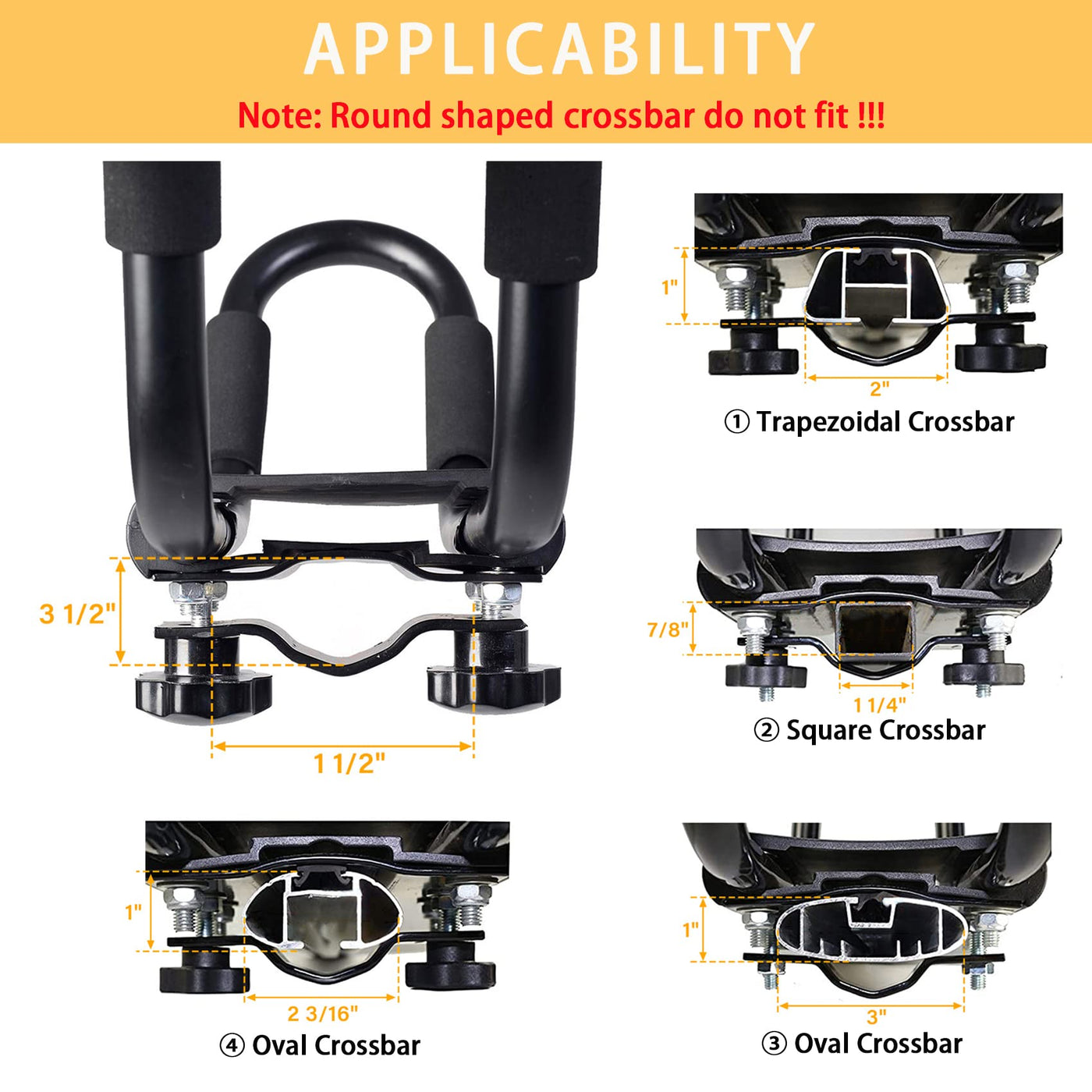 Note: 1. The carrier secures the kayak on its side, consuming minimal space on the load bar. 2. Universal fit for most factory or after market square/ oval/ flat crossbars. 3. Please check the measurements, type, and shape to make sure the item is the one that you need.
