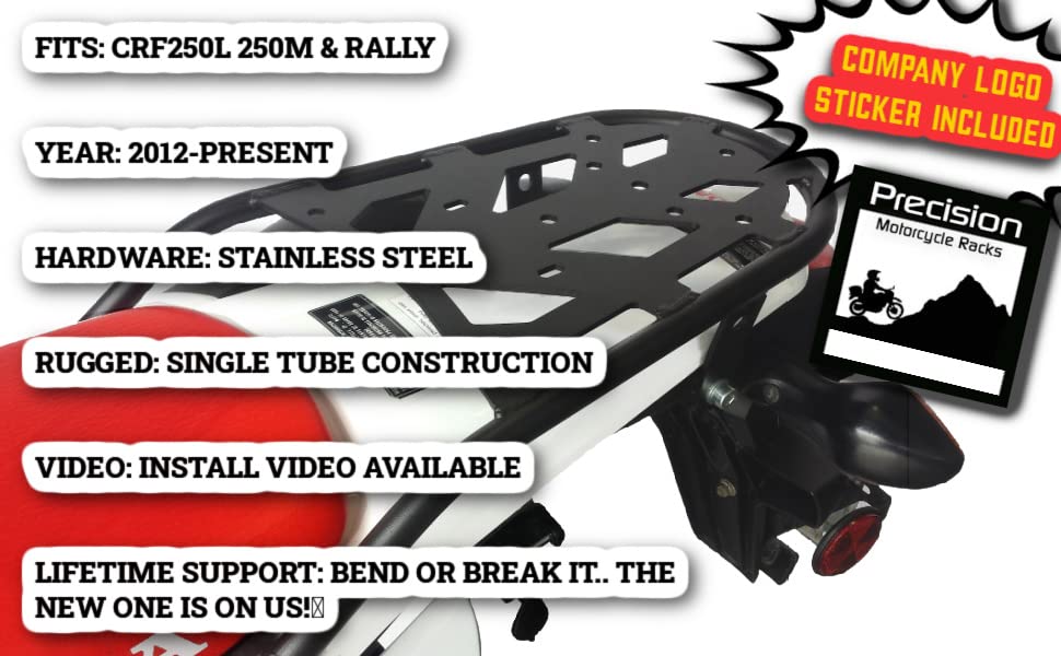 PMRACKS CRF250L CRF250M Rally rear rack for bikes 2012-Present. QUICK and EASY installation. PERFECT fit. Predrilled to accept RotoPax mounts and virtually all popular brands of luggage. Rolie bags and tail bags are a GREAT fit! We pride ourselves on HIGH QUALITY craftmanship and customer service.