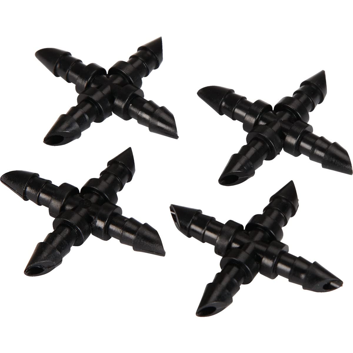Raindrip Barbed Cross .25in Four way intersection for use with 1/4' tubing. Our exclusive double barbed design. For water pressure up to 50 PSI. Instructions on back of card.