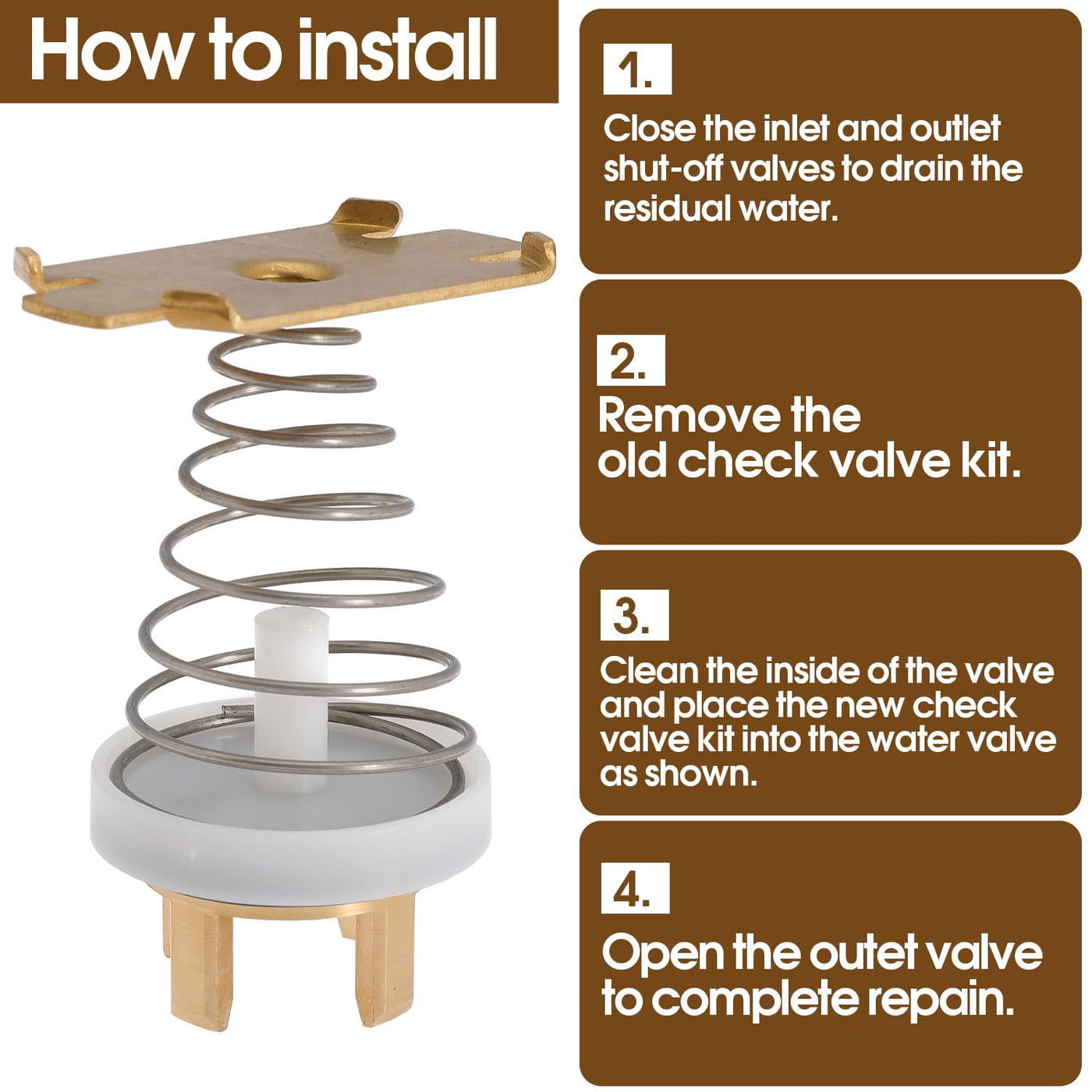 Q: How do I install the check valve assembly repair kit?A: To install the check valve assembly repair kit, follow these steps: 1. Close the inlet and outlet shut-off valves to drain residual water. 2. Remove the old check valve kit. 3. Clean the inside of the valve and place the new check valve kit into the water valve as shown. 4. Open the outlet valve to complete the repair.
