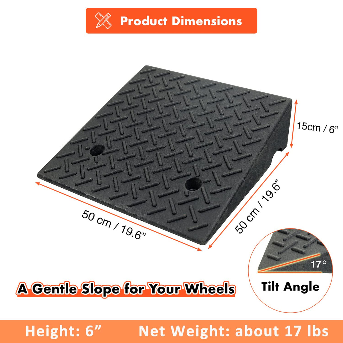 Q: Can this curb ramp be used for wheelchairs?A: Yes, the curb ramp is designed to be wheelchair-friendly with a 17-degree tilt angle, providing a safer and smoother transition for wheelchair users. For added safety, we recommend purchasing two ramps for use with wheelchairs.
