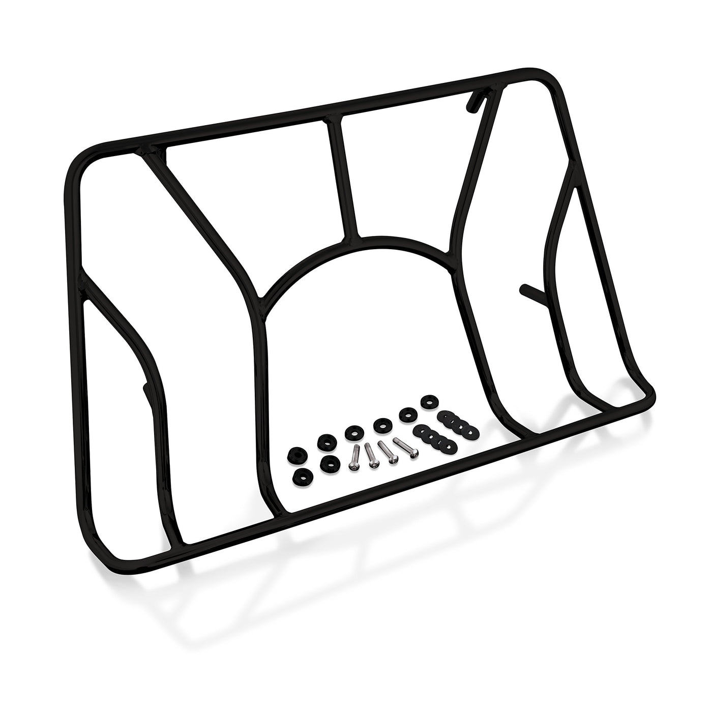 This tubular style satin black trunk rack is a must have addition to the Spyder. This generous 22 1/2" x 13 1/2" trunk luggage rack easily accommodates the standard luggage bags and comes with a complete set of tapered mounting spacers. These tapered black spacers allow the rack to more easily conform to the curve of the trunk and are recessed to allow the rack feet to sit into the spacer, helping spread the load over the trunk lid to alleviate stress cracking. The rubber washer under each spacer not only protects your bike's finish, but also assures water tight fit to the trunk lid. Rack works great with Hopnel h50-113bk rack bag and the short antenna 41-180. The manufacturer's trunk specs should be referenced for loading limits. Fits Can-Am Spyder RT.