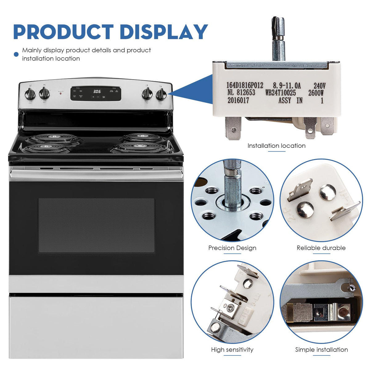 Q: What materials is the WB24T10025 switch made from?A: The WB24T10025 control switch is manufactured using premium stainless steel materials, which ensure durability and a precise fit. This high-quality construction allows you to confidently repair your appliance and maintain optimal cooking performance.