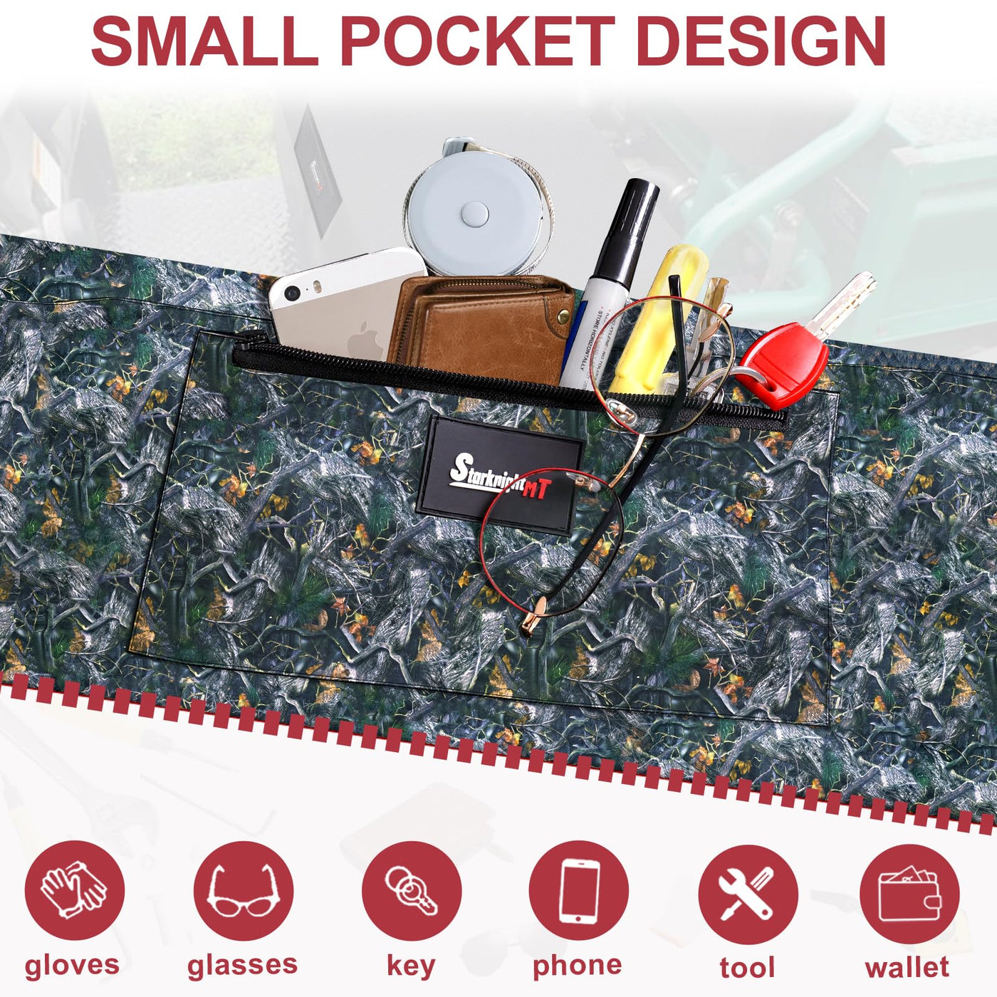Q: Can I store items in the seat covers?A: Absolutely! The front pocket of the seat cover is perfect for storing small items such as phones, keys, tools, and wallets, adding convenience to your UTV experience.