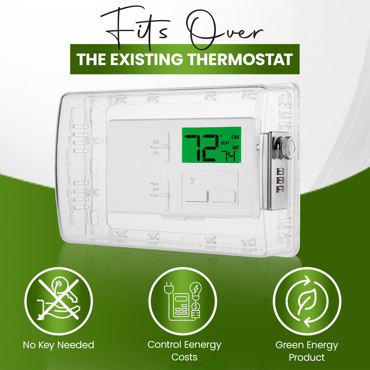 Product Features: No keys needed (keyless). Changeable 3 digit code combination lock. Fits any thermostat up to 7.25” width x 4.74” height x 2.25” depth. Clear hard plastic cover. Removable Cover.