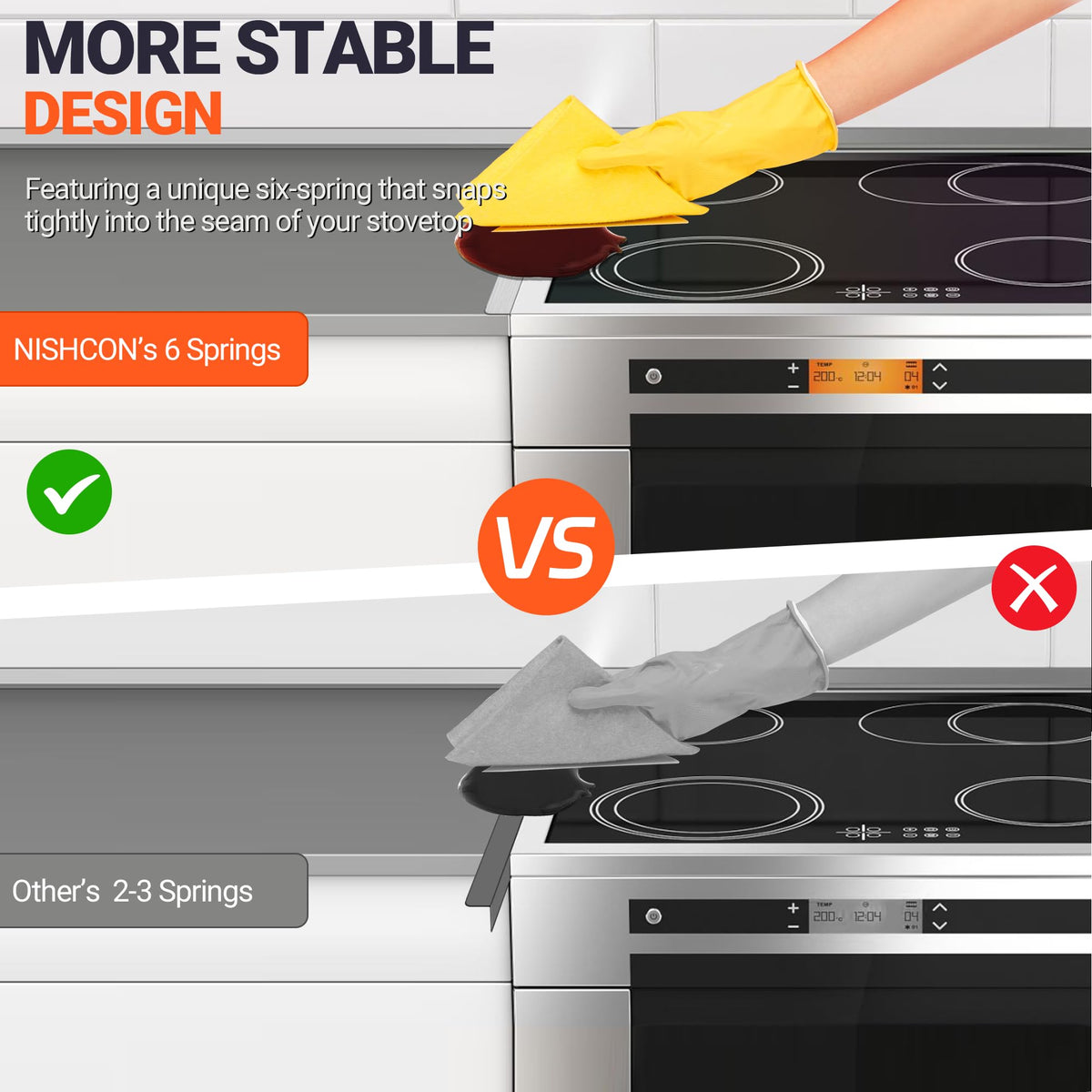 STABILIZING NON-SLIP ADJUSTABLE DESIGN: The stove guard kit includes two stove gap covers, each with a unique proprietary 3 spring design that prevents them from sliding and moving while you are cooking or cleaning, and they are also very easy to remove when needed. Even during intense cooking sessions, our stainless steel crevice covers stay firmly in place, keeping the cooking area safe and clean!