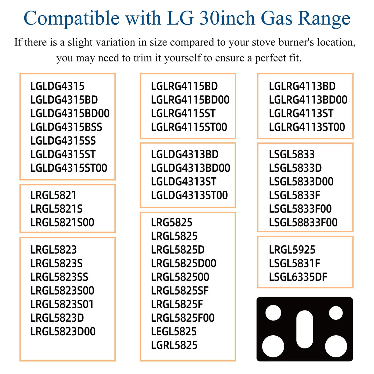 Q: Is this stove cover compatible with my LG gas range?A: Yes, this stove cover is specifically designed to fit a variety of LG gas range models, including LGLDG4315, LRG4115, LRG4113, LDG4313, and more. Please check the compatibility list in the product description to ensure a perfect fit.