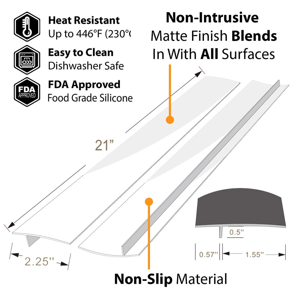 Q: What are the dimensions of the Stove Gap Covers?A: The Stove Gap Covers are 21 inches long and 2.25 inches wide, designed to fit most standard gaps between stoves and countertops.