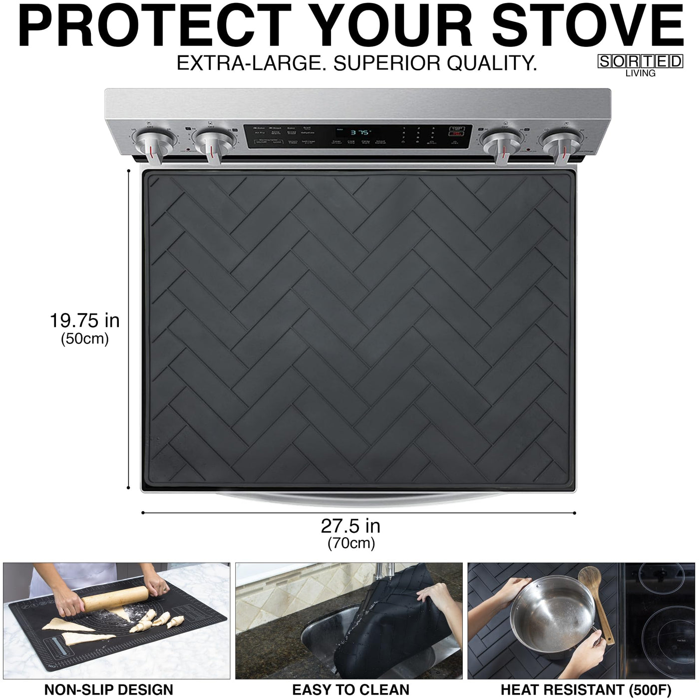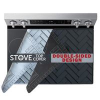 Q: What are the dimensions of the silicone stove top cover?A: The silicone stove top cover measures 27.5 inches in length and 19.9 inches in width, making it suitable for most glass top stoves.