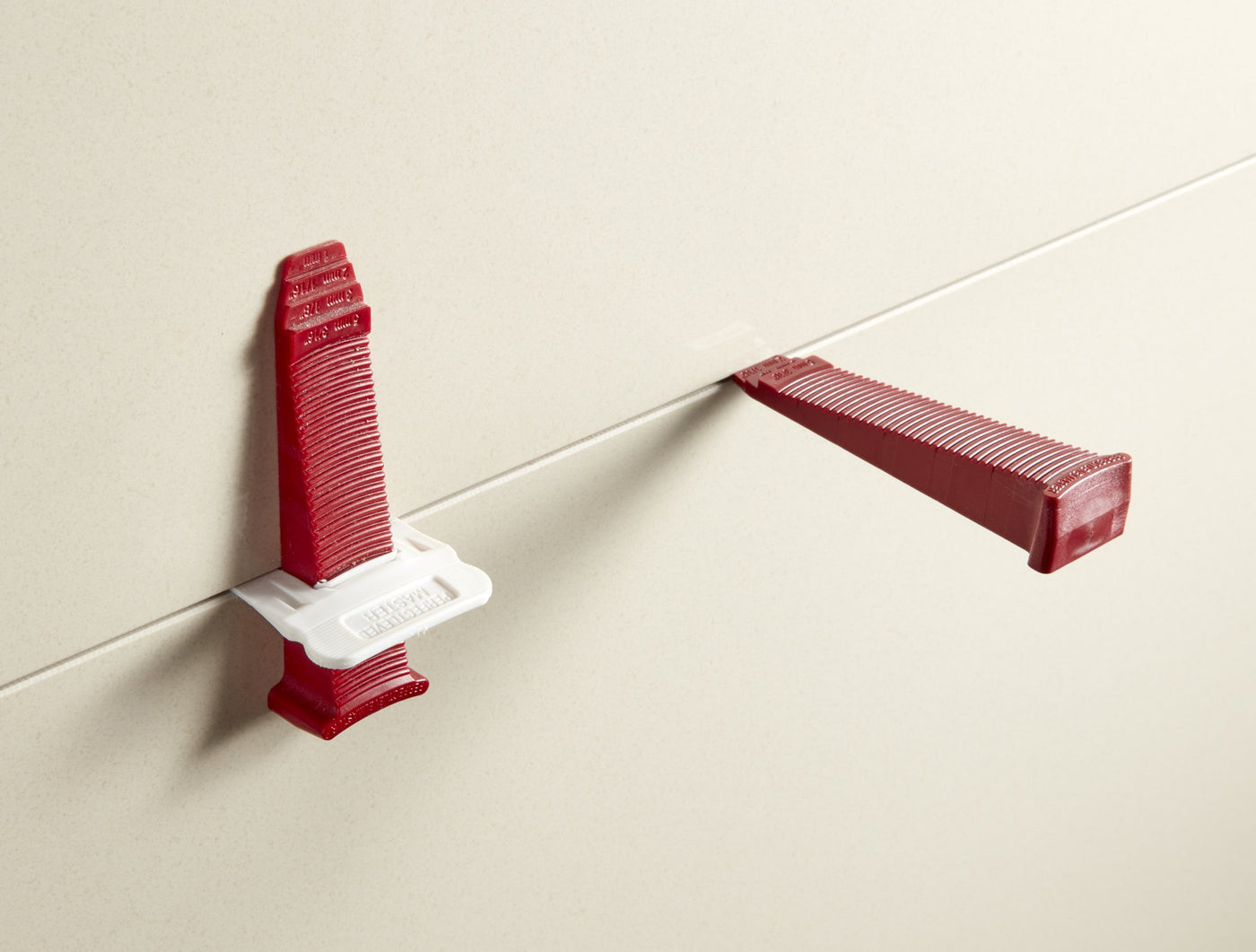 Q: What is the T-Lock PERFECT LEVEL MASTER tile leveling system and how does it work?A: The T-Lock PERFECT LEVEL MASTER is a professional tile leveling system designed to eliminate lippage between tiles. It uses a two-part system, consisting of clips (spacers) and wedges, to ensure that each tile is level with the surrounding tiles during installation. This system allows for a faster installation process and helps prevent tiles from warping as the thinset cures.