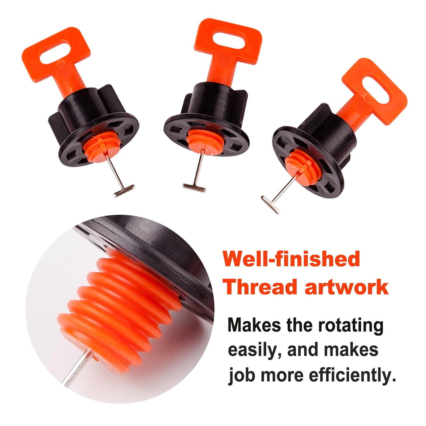 Steps: 1. Insert T-shaped steel needle along the seam (Tips: the width of tile spacers we made wider than 2mm which make easy for you to take out needles) 2. After the steel needle enters tile gap, turn 90° to make the steel needle clip on the bottom of the two tiles. 3. Tighten the black leveling nut by hand or wrench until the two tiles are on the same horizontal plane (Tips: pay attention to strength degree of your hand during leveling to avoid the tile dislocation caused by excessive force). 4. Before the cement or tile glue has completely dried up (usually no more than 6 hours), tighten the adjusting cover in the opposite direction, then rotate the T-pin 90 degrees so that the T-pin turns to a zigzag parallel to the tile. 5. Remove the leveler, clean and dry storage for reuse. Recyclable and economical, you can share these little gifts with family and friends.
