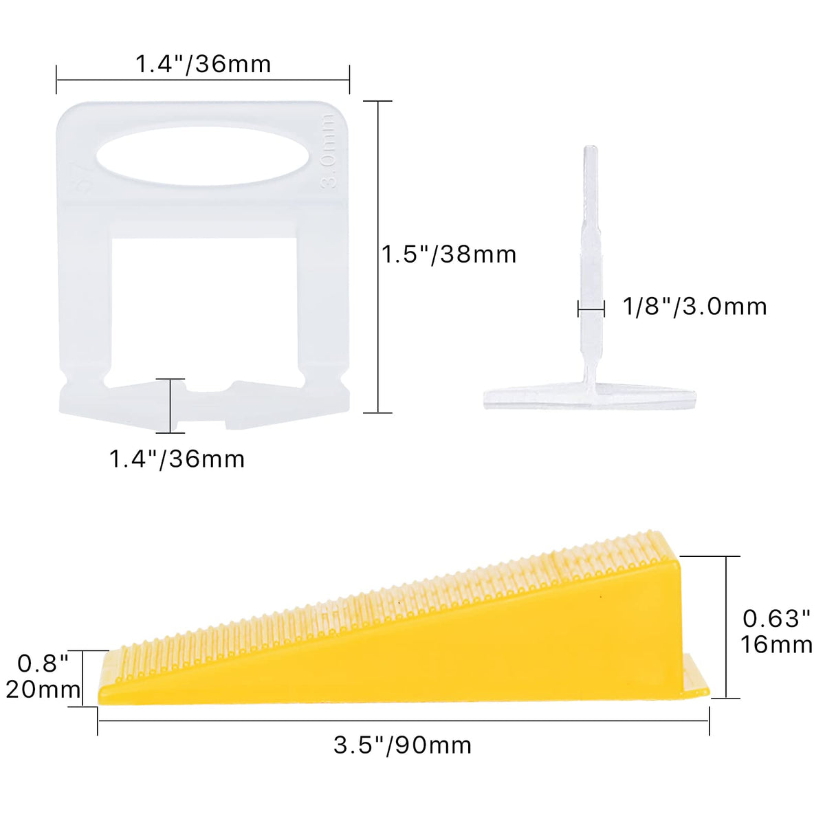 ?Package Includes?Tile Leveling System with Tile Plier 600 Piece Tile Spacers Clips 200 Piece Reusable Wedges and 1 Rubber Mallet Tile Tools Set for Stone Installation ?600Pcs Tile Clips? Suitable for 1/8' (3mm) to 1/2'(12mm) thickness of the tile, allows for a 1/16'(1.5 mm) grout joints (tile gap> 1/16'). Super easy & fast to install & remove. ?200Pcs Tile Wedges? Can be used with tile spacer clips of various sizes(1/8”, 1/12”, 1/16”, 1/32”). It will firmly hold the tile in place and is very easy to install and disassemble. The tile wedges can be reused several times which is more economical. (1 tile requires 4 wedges and 4 spacers ). ?Rubber Mallet?Crafted from premium quality rubber, exceedingly durable and reliable. The ergonomic handle delivers a non-slip and comfortable grip which also reduces hand fatigue. Ideal for a range of uses, including general building work, tile leveling, bricklaying, and mechanical work. ?Installation Tile Tool?The Tile Leveling System helps DIY and Professional tile layers increase the efficiency of laying tiles and obtain a perfect, lippage-free finish