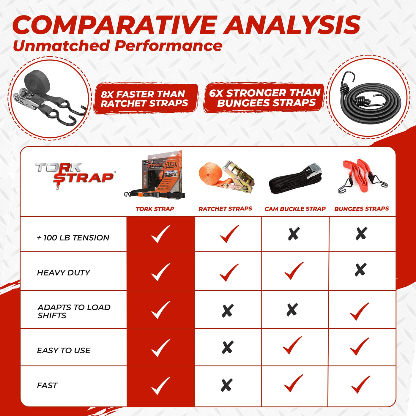 Q: What makes TorkStrap M500 different from traditional ratchet straps?A: TorkStrap M500 features a unique hybrid design that combines the ease of bungee cords with the strength of ratchet straps. It uses patent-pending adaptive technology to automatically adjust to load shifts during transport, eliminating the need for constant readjustment.