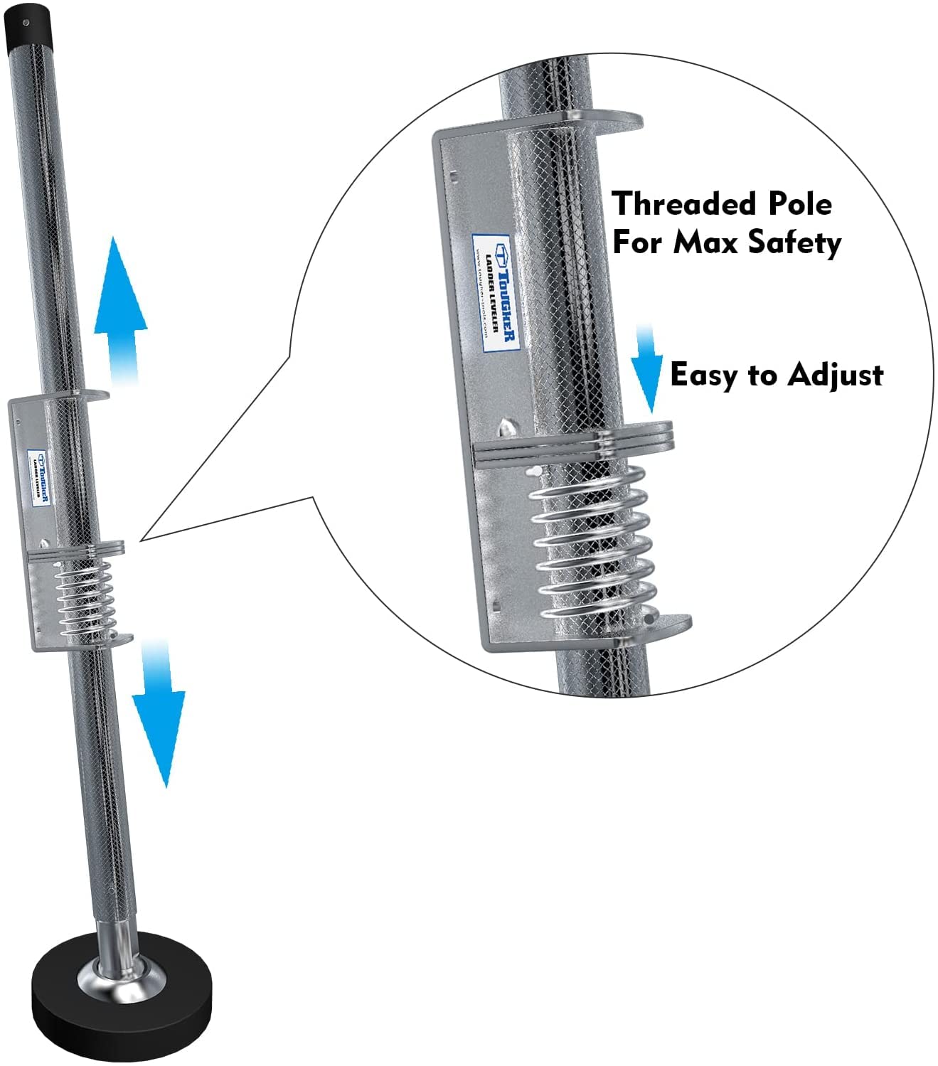 Q: What are the key features of the TOUGHER Ladder Leveler?A: The TOUGHER Ladder Leveler features high-quality alloy steel construction for durability, removable and replaceable rubber feet for maximum friction and anti-skid safety, compatibility with all types of II, I, and IA extension ladders up to 32 feet, and an adjustable design that allows for easy modifications to ensure stability on uneven surfaces.
