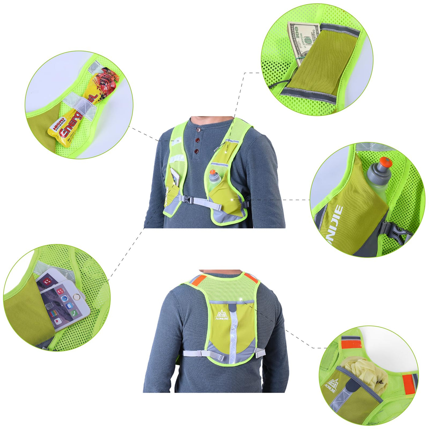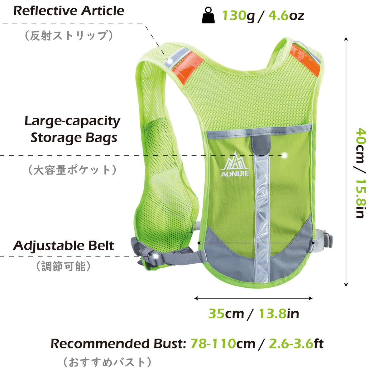 Q: Is the running vest adjustable for different body sizes?A: Yes, the running vest features adjustable chest and waist straps, making it suitable for chest sizes ranging from 30.5 to 44 inches, allowing for a customized fit.