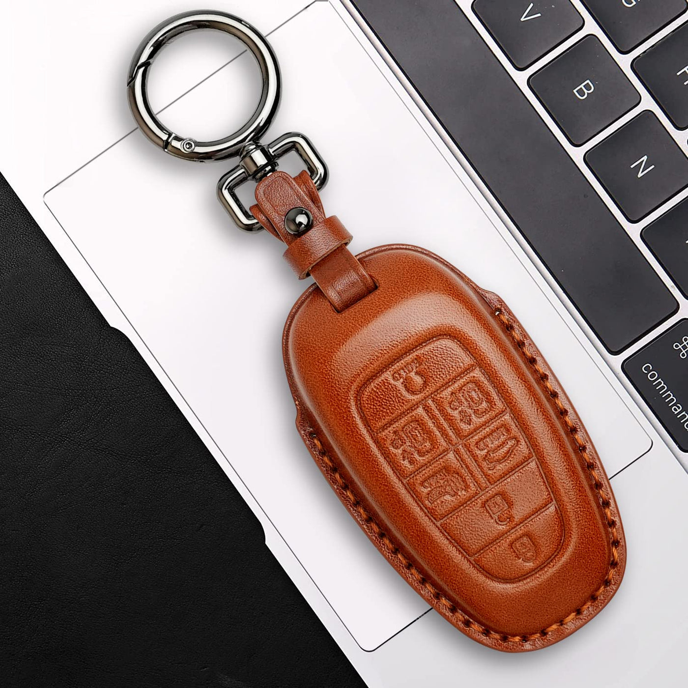 Tukellen For Hyundai Key Fob Cover Leather With Keychain Compatible With 2020 2021 Sonata,2022 Tucson Remote Key-Brown