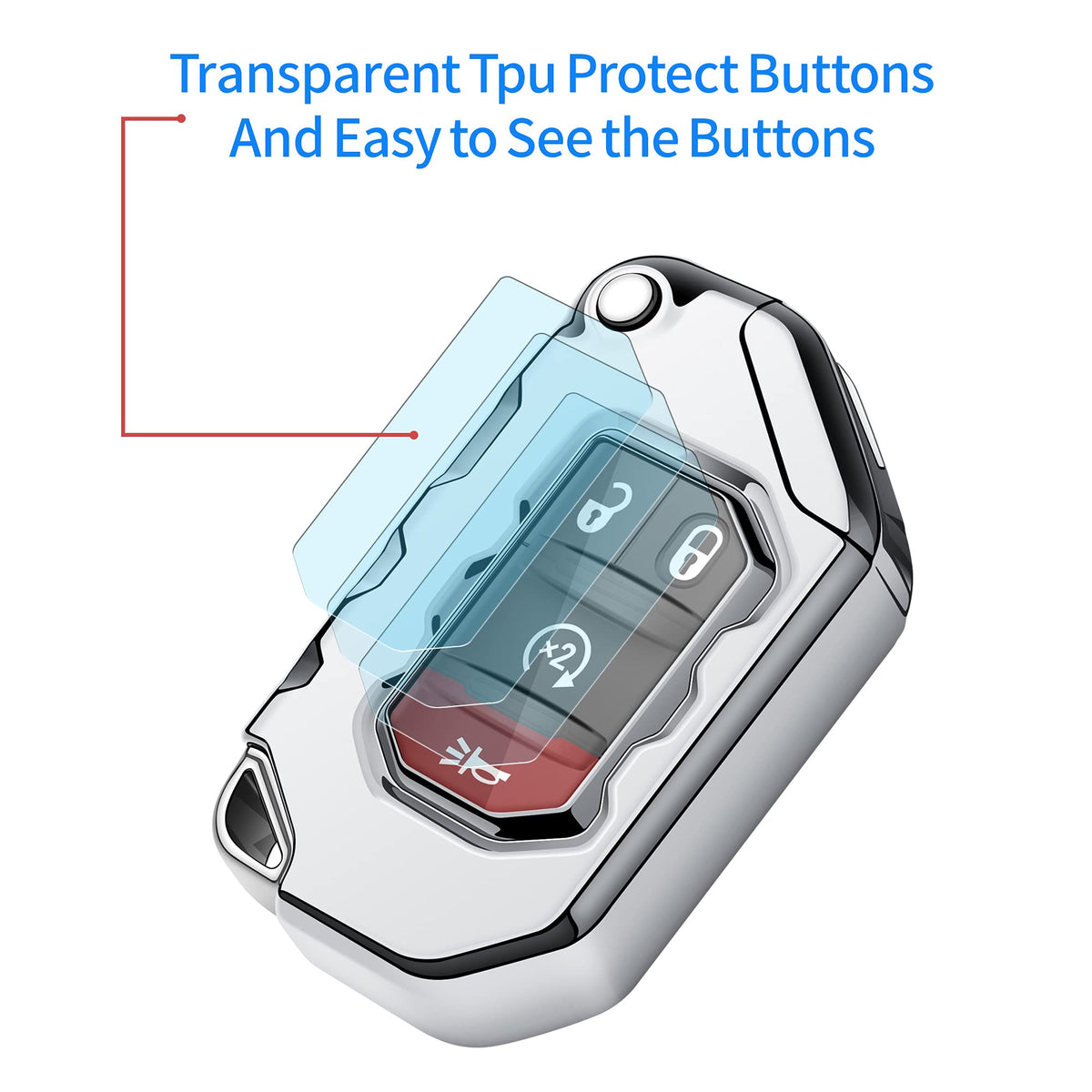 ?Fits Model?compatible with 2018 2019 Wrangler JL JLU Rubicon 2020 2021 Gladiator JT Sahara JLU flip key fob remote control | Note: Even though the car model is the same, but the car key might be different based on the different year of manufacturing, so please Double Check your Key Fob with the picture at left before Purchasing | Material: Made with premium TPU. Super thin, soft, trending looking and pretty durable. Make your key fob look new and premium | 360 Degree protection: Full protection of back and forth, left and right. It can effectively protect your car key from falling, shock, scratch and dust | After-sales:Unconditionally refund or free replace if any defective or quality problems, any problem please feel free to contact us, we offer life-time friendly customer service.