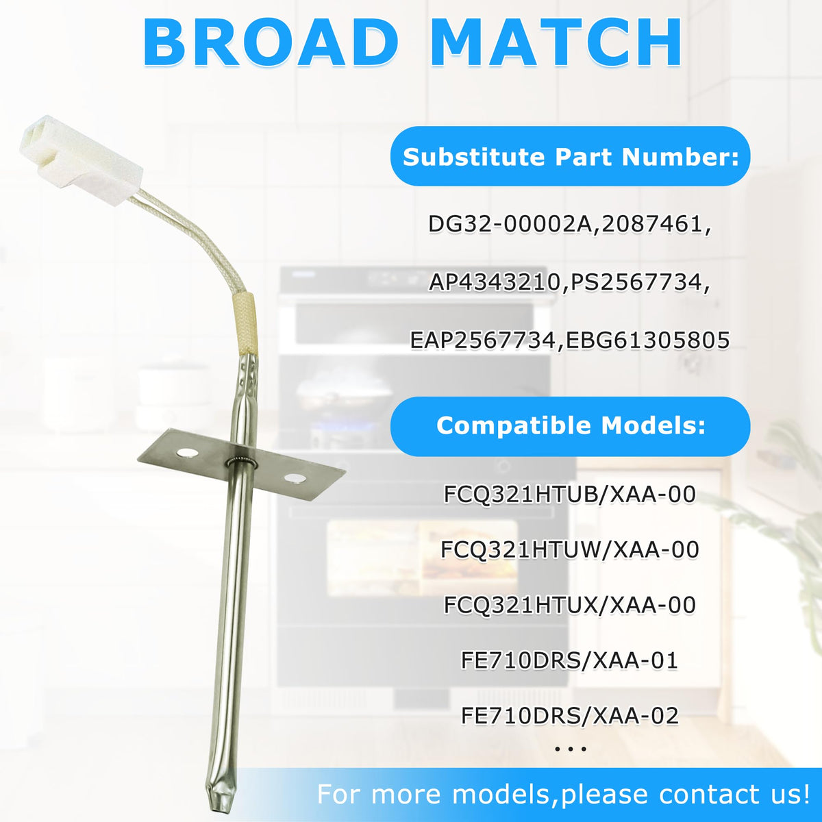 Q: What models is the DG32-00002B Range Oven Temperature Sensor compatible with?A: The DG32-00002B Range Oven Temperature Sensor is compatible with several Sam.sung models, including FCQ321HTUB/XAA-00, FCQ321HTUW/XAA-00, FCQ321HTUX/XAA-00, FE710DRS/XAA-01, FE710DRS/XAA-02, and many others. Please check your oven model for compatibility.