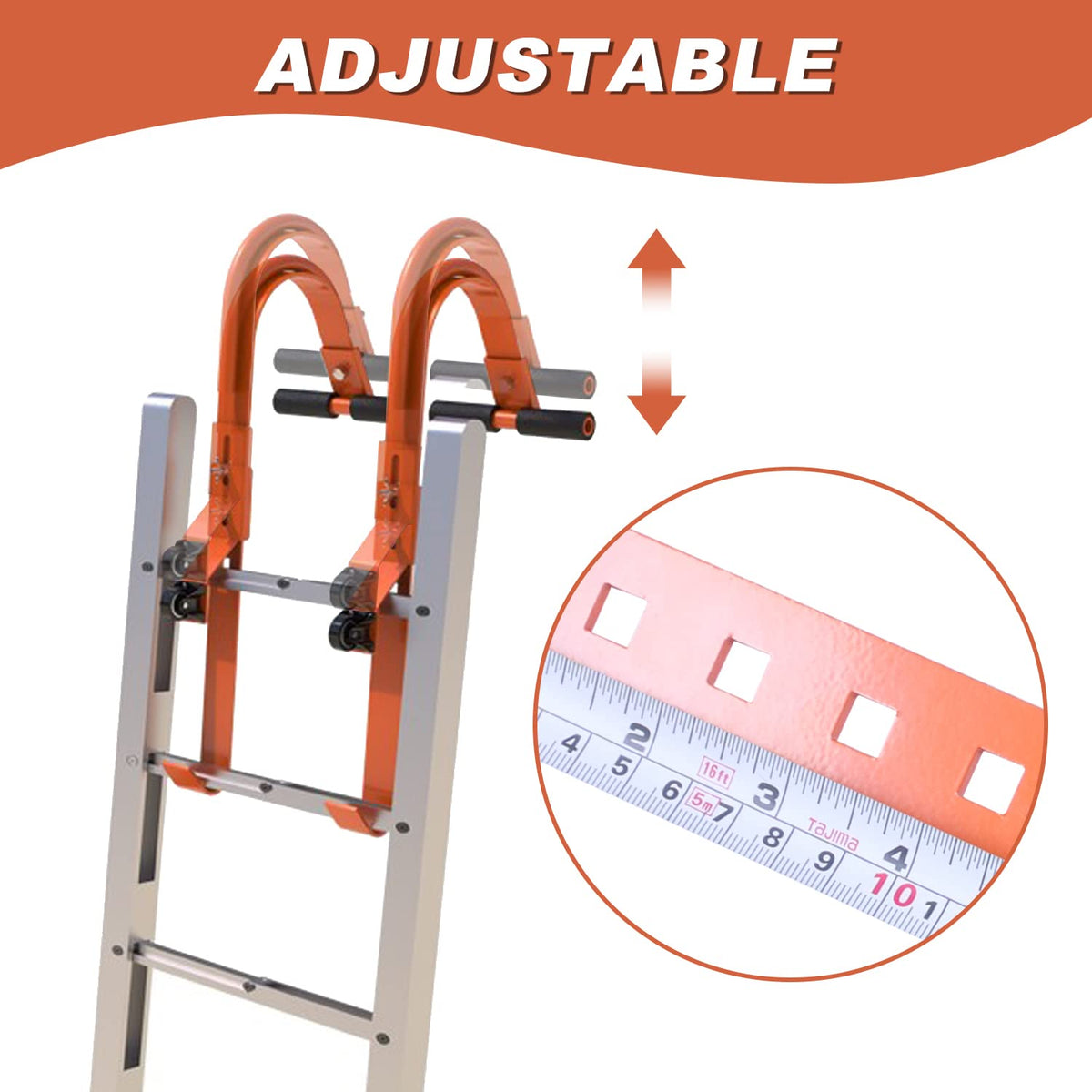 The ladder roof hooks are installed at the top of the ladder when repairing the roof and are used to tightly connect the ladder to the edge of the roof to ensure safety during the repair process. Ladder hooks for roof are made of high quality aluminum for safety and stability, and can hold up to 500 pounds with four size adjustment holes to perfectly match your ladder. At the same time the T-shaped handle design, more stable, T-shaped handle wrapped with rubber material, can prevent the maintenance process sliding, to maintain stability. Ladder ridge hooks also come with an anti-corrosion coating, long-lasting enthusiastic orange color to accompany you in every repair. Installation is very easy, just tighten nuts to make it strong and reliable. Choose it! Installation steps. 1. Install the T-bar to the curved bar. 2. Choose the right installation hole position according to your ladder tread spacing, and install the straight rod to the curved rod. 3. Install the wheels to the right position. Note: This product is suitable for slope roofs with roof angle not more than 50°.
