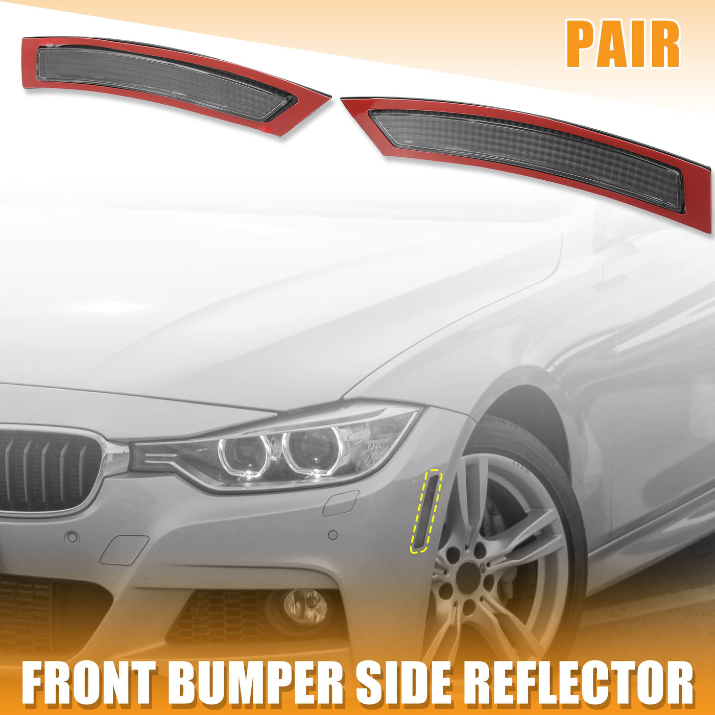 Features:Replaces your broken or worn rear bumper reflector restoring the original look of your car.The bumper reflector side marker is made from the highest quality materials can handle tough environments.This is a non-OEM product, accessory only!Specification:Type: Front Bumper ReflectorsPlacement on Vehicle: Front, Left, RightMaterial: PlasticColor: Red, ClearSize: 22.5x3.8cm / 8.86''x1.50''(L*W)Bulbs Included: NoPart Number: 63147162313 63147162314Fitment:for BMW 328i Base 2.0L L4 - Gas, 3.0L L6 - Gas 2012 2013for BMW 328i xDrive Base 2.0L L4 - Gas, 3.0L L6 - Gas 2013for BMW 328i xDrive Base 3.0L L6 - Gas 2009-2012for BMW 328i Base 3.0L L6 - Gas 2007-2011for BMW 328xi Base 3.0L L6 - Gas 2007 2008for BMW 335xi Base 3.0L L6 - Gas 2008for BMW 335i Base 3.0L L6 - Gas 2007-2013for BMW 335i xDrive Base 3.0L L6 - Gas 2009-2013for BMW 335is Base 3.0L L6 - Gas 2011-2013for BMW M3 Base 4.0L V8 - Gas 2008-2013Note:Please confirm the product if it matches your car before purchasing.Package Included:1 Pair Front Bumper Side reflector