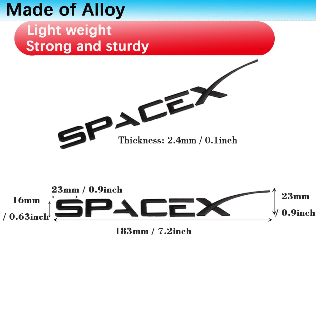 Q: What size is the SpaceX badge?A: The SpaceX badge measures 7.2 inches in length and 0.9 inches in width, making it a perfect fit for your Tesla.