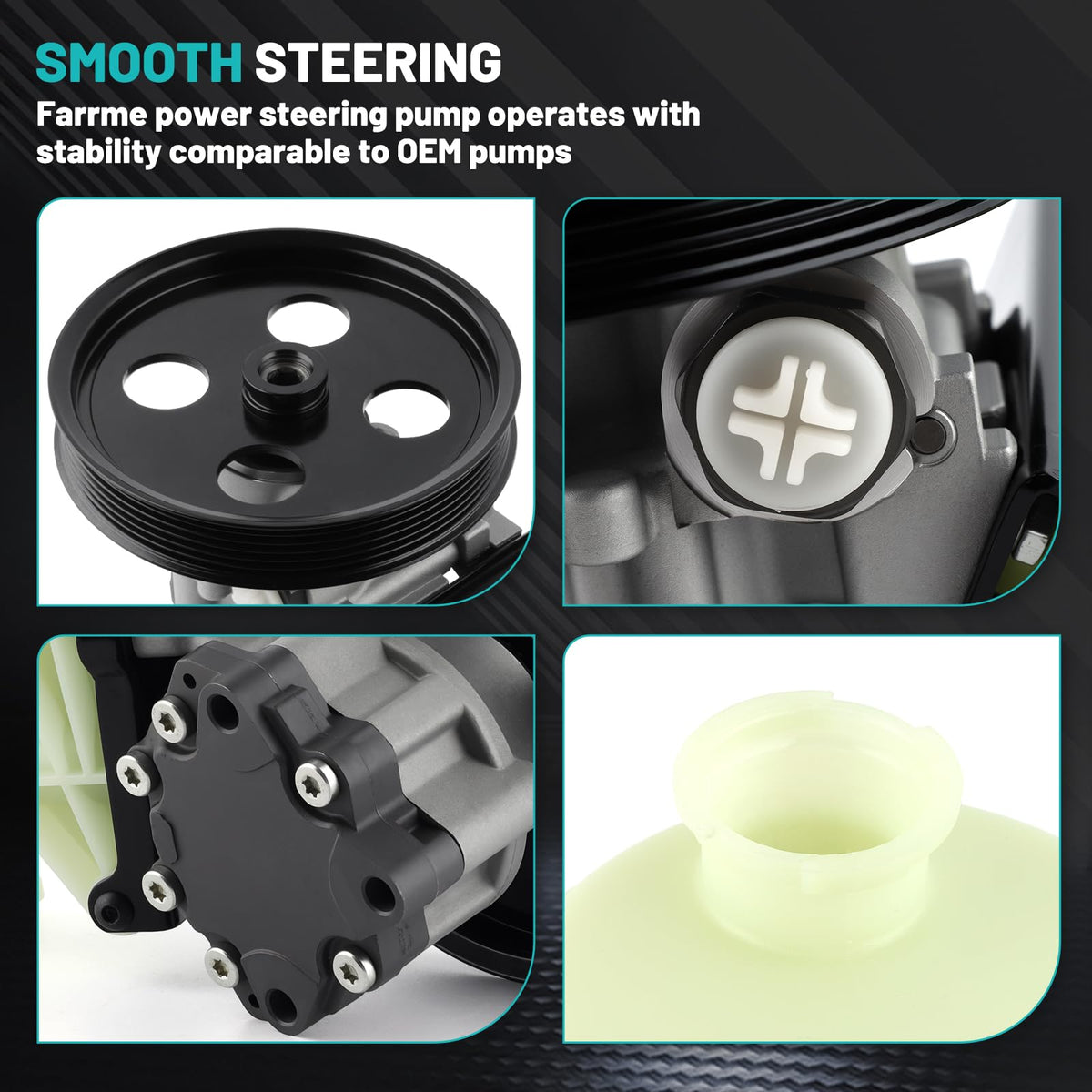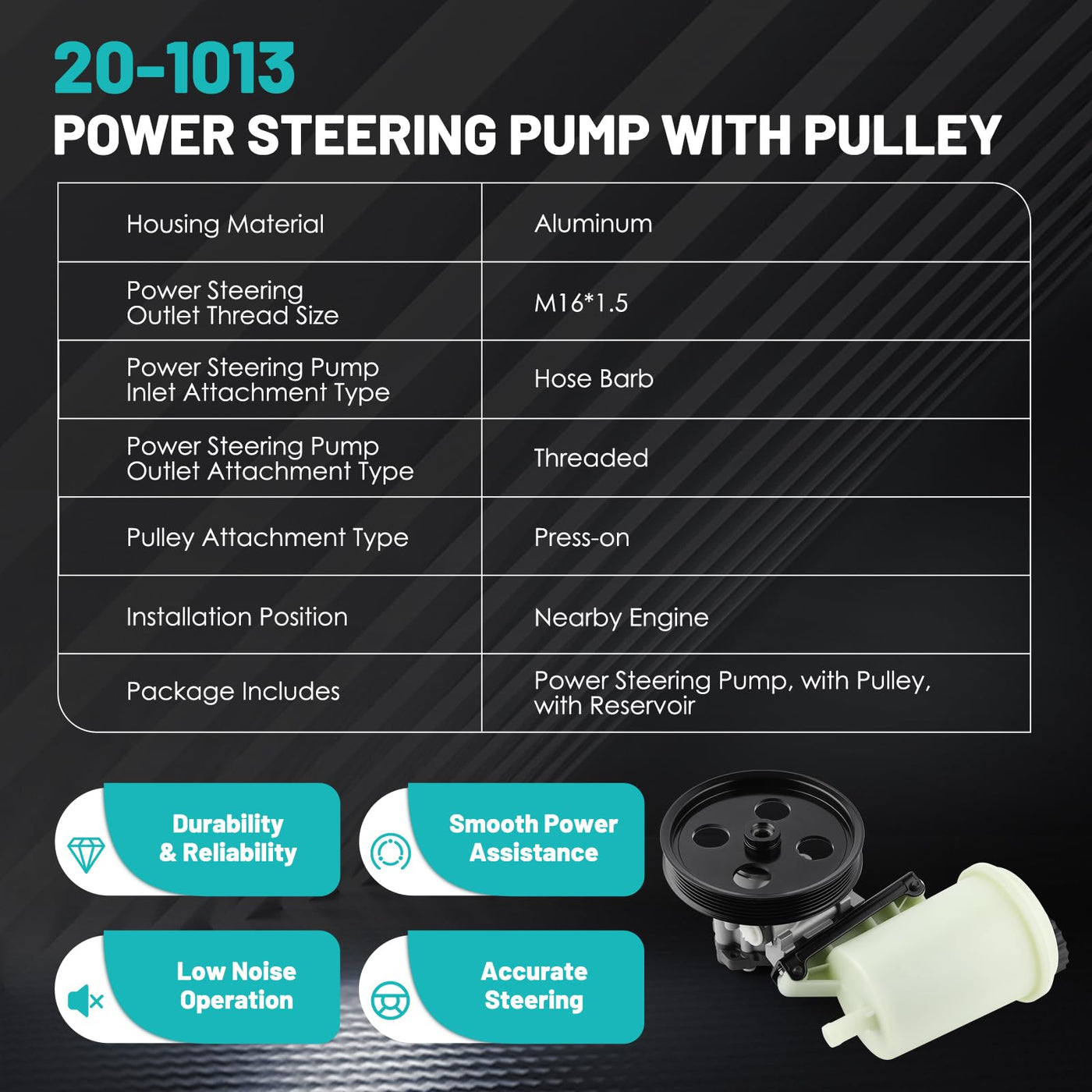 Upgrade Your Vehicle's Steering Performance with the 20-1013 Power Steering PumpPart Number:20-1013, 201013, 214048, 55398903AD, 55398903AE, 55398904AD, 55398904AEPower Steering Pump Feature:Effectively reduce resistance to the steering wheel, making the driver easier.Made of alloy and plastic, test before delivery.Sophisticated design can match your power steering pump.Find the failed part, directly replace the new power steering pump.Compatibility:Compatible with Dodge-Ram 1500 V6 3.7L 2009-2010Compatible with Dodge-Ram 1500 V8 4.7L 2009-2010Compatible with Dodge-Ram 1500 V8 5.7L 2009-2010Note: This list is a sample of all the compatible cars for this part. Make sure this product fits your car by using the part finder above.Why choose Farrme Power Steering Pump with Pulley:1. Superior Quality: Farrme 55398903AD power steering pump is built with exceptional quality and durability, ensuring long-lasting performance and reliability.2. Efficient Steering Performance: Farrme pump generates the necessary hydraulic pressure to provide efficient and responsive steering assistance, making your driving experience smooth and precise.3. Enhanced Reliability: We prioritize reliability in our product design, minimizing the risk of sudden failures or leaks, allowing you to drive with confidence and peace of mind.4. OEM Part Number: This 55398903AD power steering pump is designed and manufactured with OEM standards.5. Direct Replacement: This steering system pump is a direct replacement product. If your original power steering pump is failing or leaking, this replacement steering pump could be your best choice.6. Function: The power steering pump with pulley is designed to provide hydraulic assistance to the steering system, making it easier for drivers to turn their vehicle's wheels.7. Improved Steering Control: The power steering pump enhances steering control by supplying pressurized fluid to the steering gear, reducing the effort required to maneuver the vehicle.IMPORTANT NOTICE BEFORE INSTALLATION:?Please verify your vehicle make, model, year, engine, and OEM part number before installation. Contact-us if you're unsure about compatibility.? Flush the entire power steering system thoroughly before installing the new pump. Contaminated fluid can lead to premature failure.? Always replace old O-rings and seals on both high-pressure and return hoses. Reusing worn seals can cause external leaks.? Use only the manufacturer-recommended power steering fluid. Mixing fluid types can damage the system.? Do not overtighten mounting bolts. Excessive torque can crack the pump housing.? Bleed air from the system by turning the steering wheel fully left and right several times before starting the engine, then repeat after startup.? Professional installation is strongly recommended. Improper installation may lead to noise, leaks, or loss of power assist.Signs of a faulty power steering pump(aka: ''power assit pump'' or ''vane pump'') include:? steering fluid leaks? squealing noise when steering? heavy and jerky steering? metal flakes in the fluid? power steering symbol on dashboardPrecautions for installation:About Noisy:Check whether the resistance of the suction pipe is too high.Check whether the pressure adjustment of the safety valve is too high.The gas in the pump must be evacuated, check the tightness of each joint, prevent air from entering.About Leaking:Check whether the pipes and pipe joints are damaged.Tighten the fixing screws of the booster pump.Check, clean or replace the filter device, keep the oil circuit unblocked, and avoid the valve core being blocked by foreign matter.How to install the power steering pump:1. Ensure the vehicle is stationary and disconnect the negative terminal of the battery.2. Locate the original power steering pump, typically located near the front of the engine, close to the crankshaft and steering system.3. Using the appropriate tools, loosen and remove the belt from the original power steering pump, making a note of the belt's routing for future installation.4. Unbolt or remove the fastening screws of the original power steering pump and take it off the vehicle.5. Align the new power steering pump with the corresponding bracket or base on the vehicle and secure it in place using bolts or fastening screws.6. Install the belt correctly on the new power steering pump, following the routing recorded from the original pump.7. Ensure the belt is properly tensioned.8. Check the tightness of all installed bolts or fastening screws to ensure the pump is securely mounted.9. Reconnect the negative terminal of the vehicle's battery.10. Start the vehicle and check if the power steering pump operates smoothly without any abnormal noises or fluid leaks.