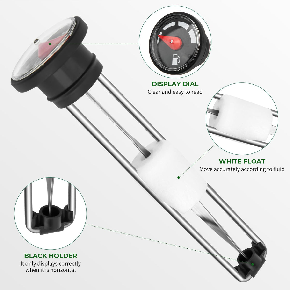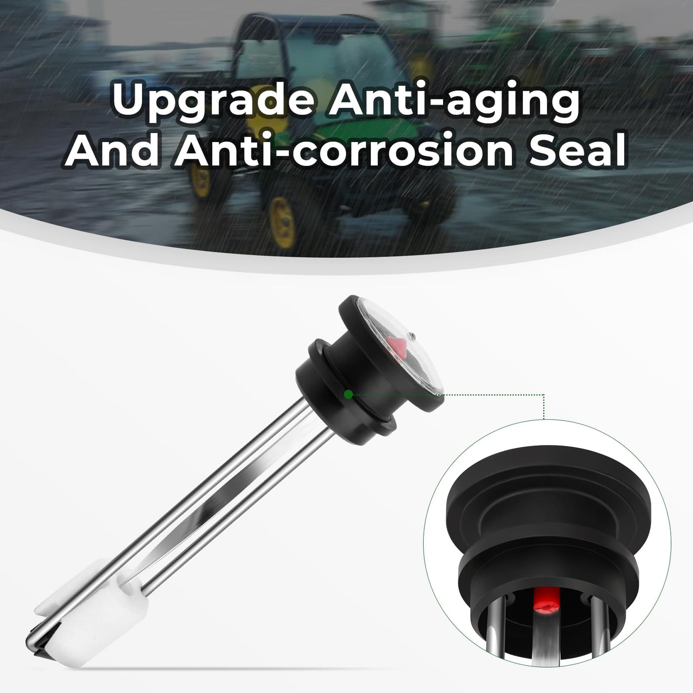 Q: What are the key features of this fuel gauge gas cap?A: The fuel gauge gas cap features an exact gauge structure that allows the float to move accurately. It includes an upgraded anti-aging and anti-corrosion seal to ensure durability and prevent leaks. This makes it a reliable choice for your John Deere Gator.