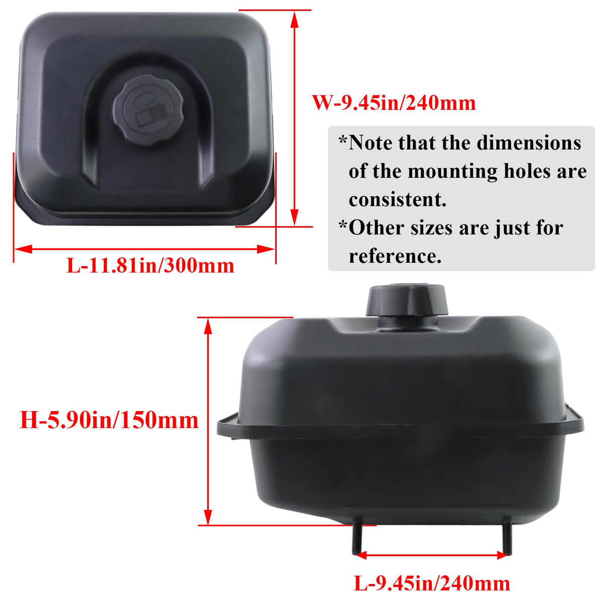 Q: What are the dimensions of this gas fuel tank?A: The dimensions of the fuel tank are as follows: Length - 11.81 inches (30 cm), Width - 9.45 inches (24 cm), and Height - 8.86 inches (22.5 cm).