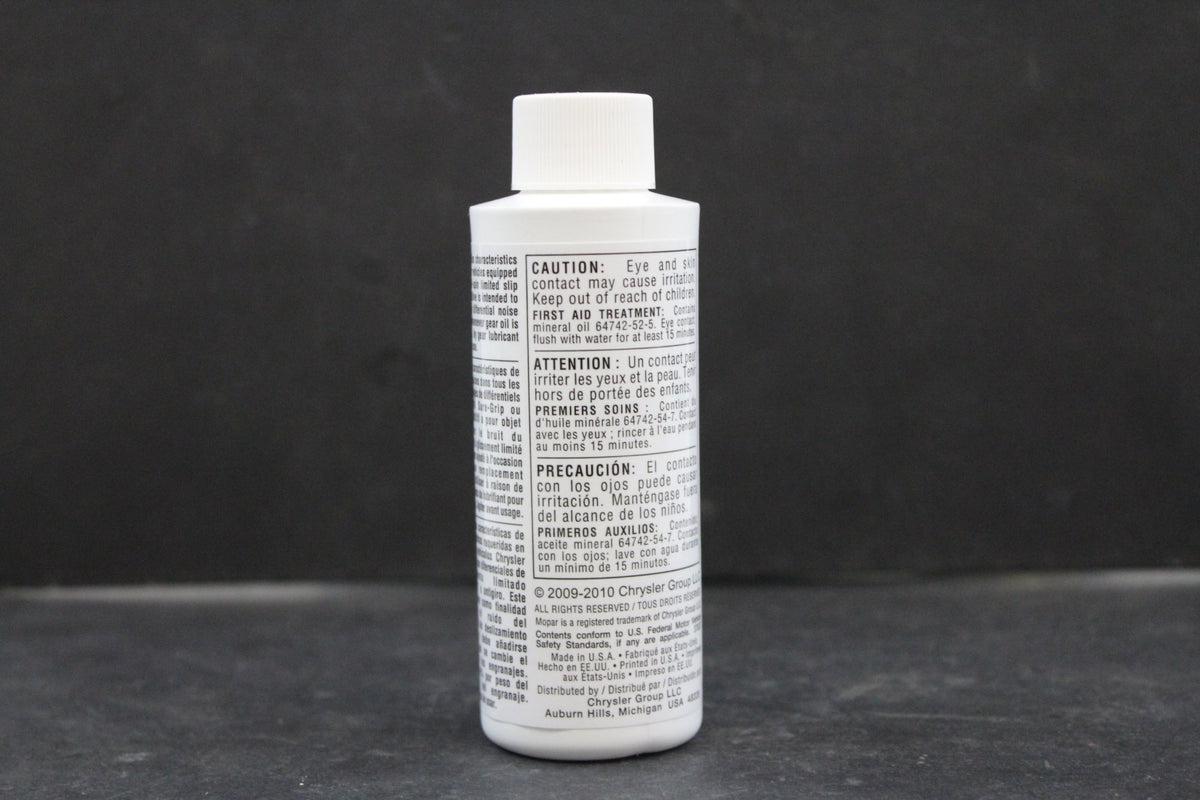 Q: What are the dimensions and weight of the Mopar Limited Slip Additive bottle?A: The Mopar Limited Slip Additive comes in a 4 oz. bottle with dimensions of approximately 5.791 cm in length, 8.001 cm in height, and 5.994 cm in width. The bottle weighs about 0.3 kg.