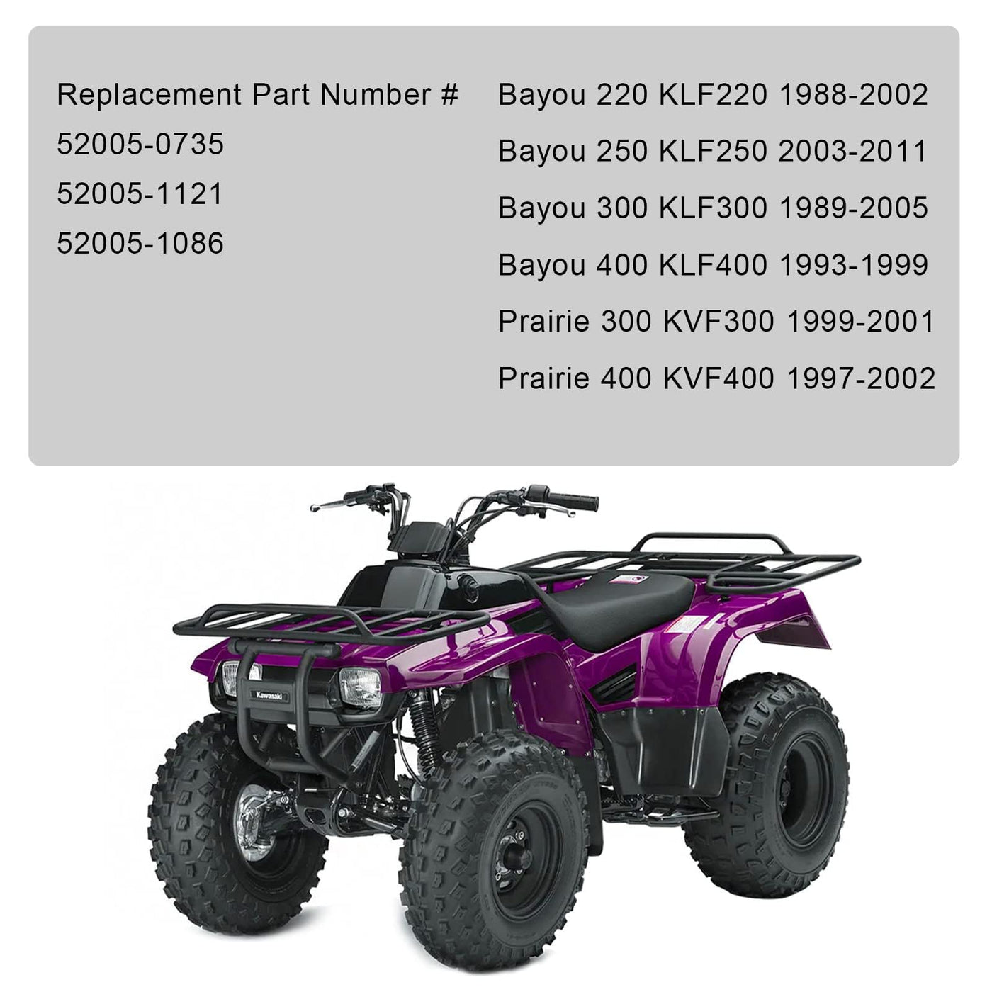 Q: What ATVs are compatible with the GXARTS Fuel Gauge?A: The GXARTS Fuel Gauge is compatible with several Kawasaki ATVs, including the Bayou 220 (KLF220) from 1988-2002, Bayou 250 (KLF250) from 2003-2011, Bayou 300 (KLF300) from 1989-2005, Bayou 400 (KLF400) from 1993-1999, Prairie 300 (KVF300) from 1999-2001, and Prairie 400 (KVF400) from 1997-2002. Please ensure to verify your ATV's make, model, year, and OE number before purchasing.