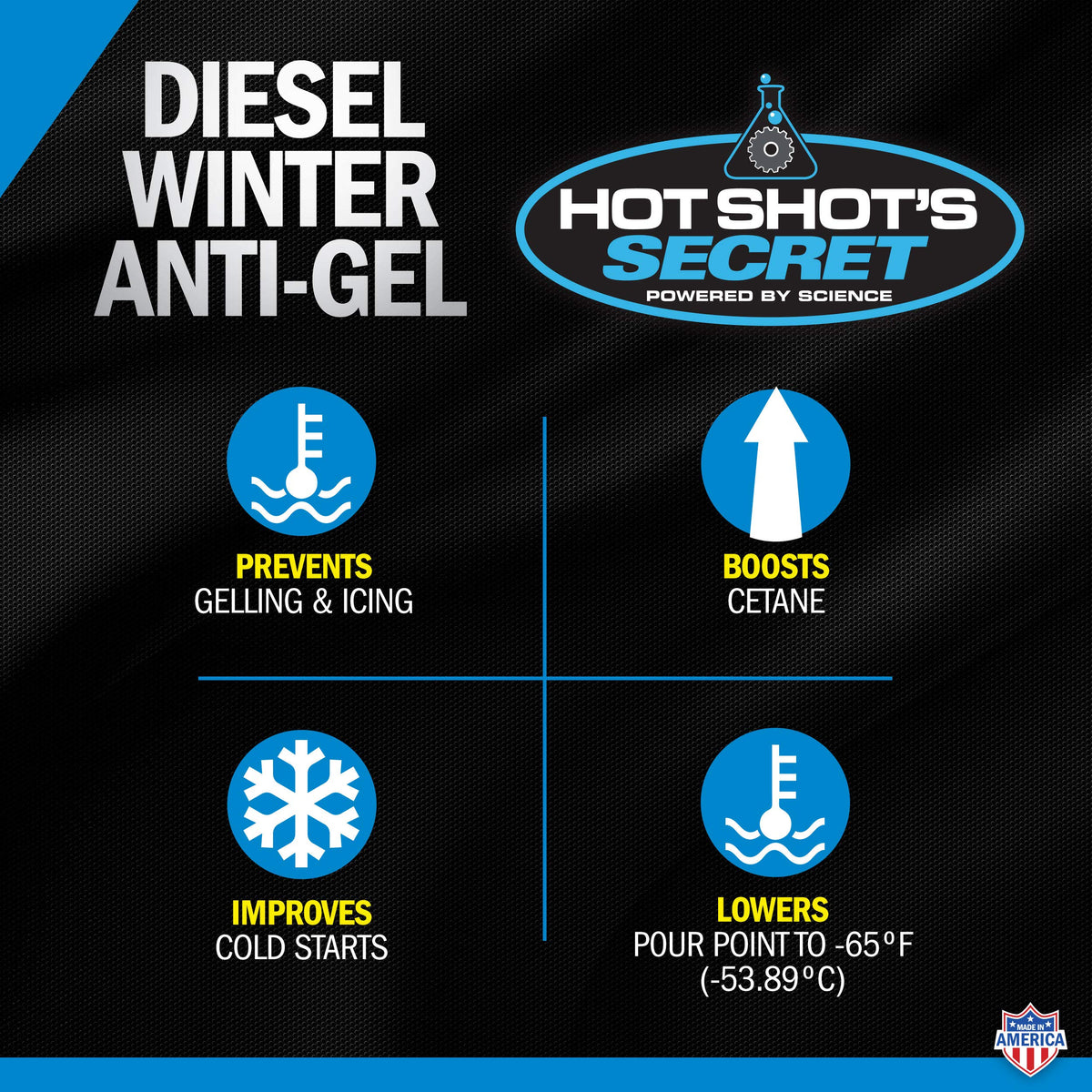 Q: What is Hot Shot's Secret Diesel Winter Anti-Gel used for?A: Hot Shot's Secret Diesel Winter Anti-Gel is designed for use in all diesel engines. It provides lubricity, stability, and winter operability, helping to prevent freeze-ups and improve cold-temperature performance.