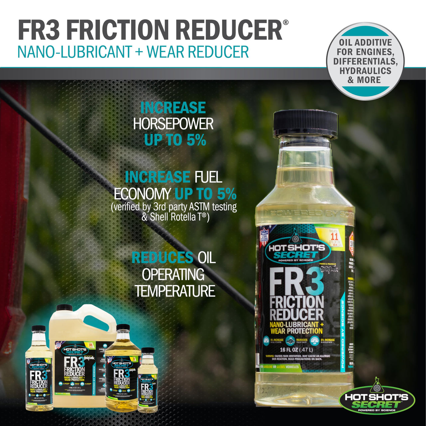 PROTECTS ENGINES: This advanced 100% synthetic oil additive is designed to enhance gas & diesel engine protection and optimize performance. Formulated to reduce friction and wear, it ensures smoother operation and extends engine life.|IMPROVES FUEL ECONOMY: The FR3 Friction Reducer is an advanced oil additive designed to enhance engine performance by reducing friction, resulting in an increase in horsepower and fuel economy by up to 5 percent.|GAS & DIESEL: This versatile product is designed for use in both diesel & gas engines, ensuring compatibility with a wide range of vehicles. It effectively functions with both synthetic & conventional oil, providing optimal performance and protection.|REDUCES NOISE: Diminishes lifter & valve noise while effectively restoring lost compression in your engine. This additive ensures optimal functionality & a quieter driving experience, making it essential to your vehicle maintenance routine.|EASY TO USE: Use 1.5 ounces per quart of oil. FR3 displaces the same amount of oil. Do not use it in combination with Stiction Eliminator and other aftermarket oil additives. Use Stiction Eliminator to deep clean the engine and protect it with FR3.|POWERED BY SCIENCE: Our products are engineered to resolve issues, make equipment last longer and improve efficiency. Nothing leaves our building with our name on it unless we know it is absolutely the BEST it can be.