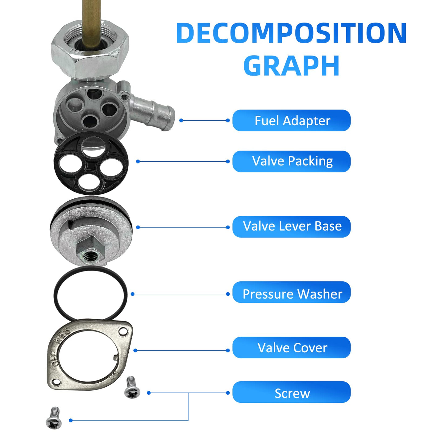 Q: What materials are used in the M MATI Fuel Valve Switch Petcock?A: The M MATI Fuel Valve Switch Petcock is made of high-quality materials, ensuring durability and longevity. The design includes a screen filter and an oil seal for optimal performance.
