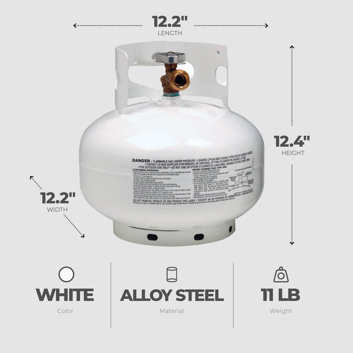 Manchester Tank & Equipment Propane Tank Features A Colonial White Powder Coated Finish, Vertical Cylinder Design And A Scalloped Foot Ring. Contains A Qcc1 Acme Valve And Boxed Construction. Includes A New Opd Overfill Protection Device. Product Weighs 11 Pounds.