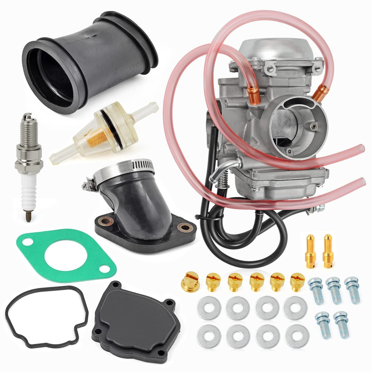 Q: What is included in the package for the MOTO1988 Carburetor?A: The package includes 1x Carburetor, 1x Intake Manifold and Tube Boot, and 1x Spark Plug.