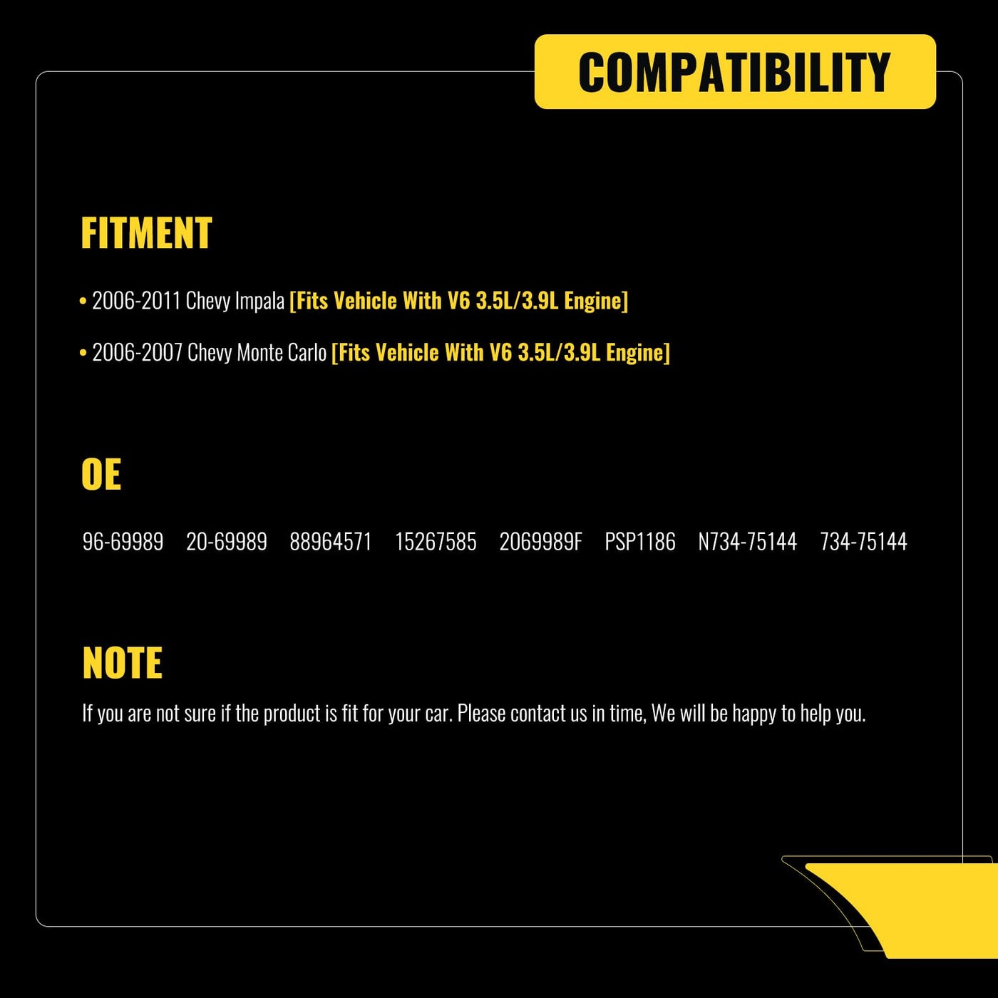 Package Includes:Qty 1 x Part # 96-69989 New Power Steering Pump.Part SpecificationsPulley: YESReservoir: YESWarranty: 12 months/12,000 mileCompatible With The Following Vehicles:• 2006-2011 Chevy Impala [Fits Vehicle With V6 3.5L/3.9L Engine]• 2006-2007 Chevy Monte Carlo [Fits Vehicle With V6 3.5L/3.9L Engine]If you are not sure if the product is suitable for your car.Welcome to send us a message for inquiry.BRAND STORYA Brand You Can Trust - > TUCARESTWe have over 30 years of Know how experience when it comes to steering system and suspension parts, serving over multiple countries across the globe for passenger and commercial vehicles.In order to service the North America market, TUCAREST begin the online business since the year 2018.We aim to offer high quality with safety ensured,efficient delivery and considerate service.All our products are strict inspected to ensure you receive the high possible quality auto parts.WHAT IS POWER STEERING PUMP?The power steering pump also known as power assist pump or steering pump.It directs power steering fluid from the reservoir into the steering gear, which applies the correct amount of pressure to turn the wheels smoothly.If you have symptoms like whining noise while turning the wheel, steering wheel slow to respond, stiff steering wheel, or squealing & groaning noises, you might need to have your old pump replaced.