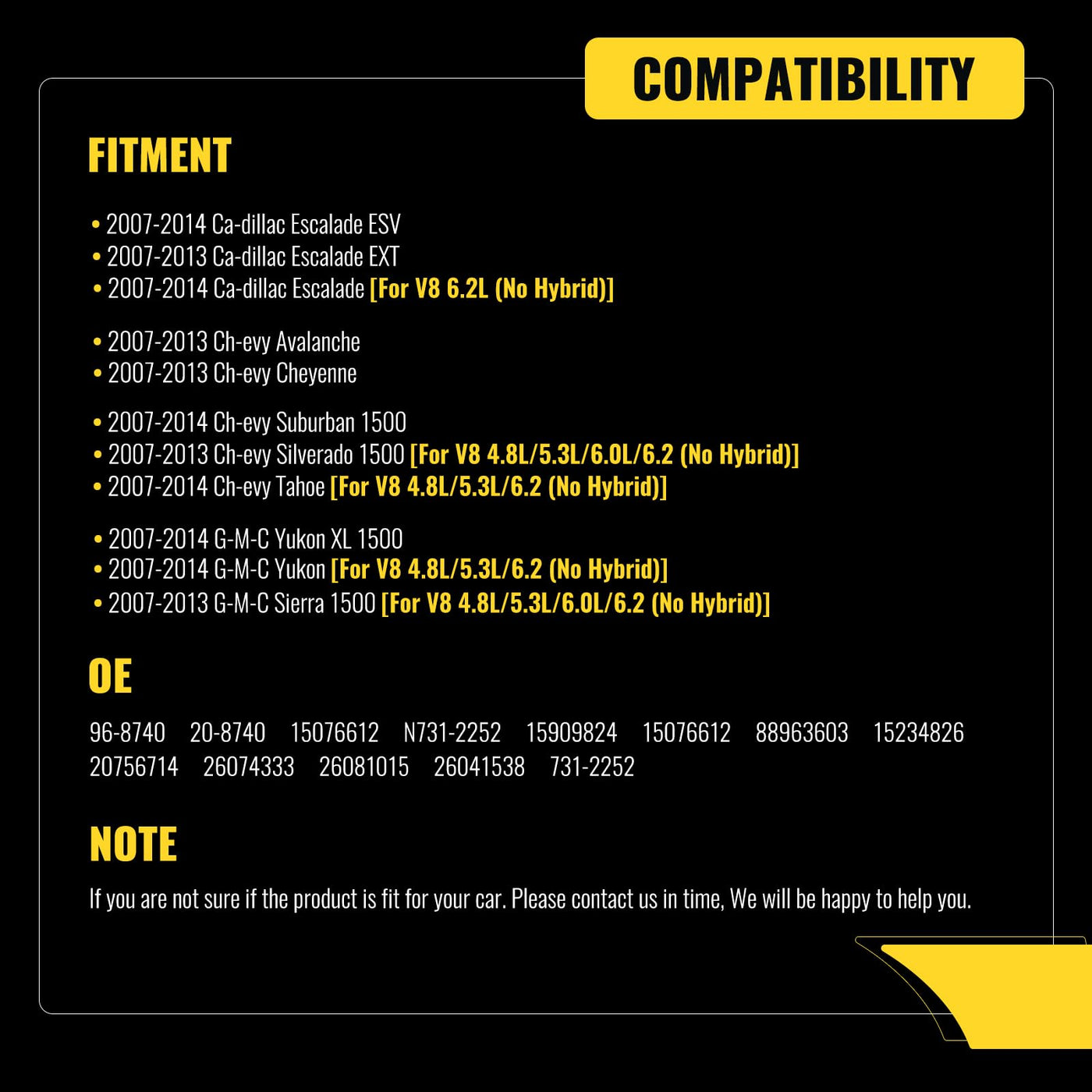 Package Includes:Qty 1 x Part # 96-8740 New Power Steering Pump.Part SpecificationsPulley: NOReservoir: YESReturn Pipe: NOWarranty: 12 months/12,000 mileStandard Pump Compatible With The Following Vehicles:• Ca-dillac2007-2014 Escalade [For V8 6.2L (No Hybrid)]2007-2014 Escalade ESV 2007-2013 Escalade EXT • Chevy2007-2013 Avalanche 2007-2013 Cheyenne 2007-2014 Suburban 1500 2007-2013 Silverado 1500 [For V8 4.8L/5.3L/6.0L/6.2 (No Hybrid)]2007-2014 Tahoe [For V8 4.8L/5.3L/6.2 (No Hybrid)]• G-M-C2007-2014 Yukon XL 1500 2007-2014 Yukon [For V8 4.8L/5.3L/6.2 (No Hybrid)]2007-2013 Sierra 1500 [For V8 4.8L/5.3L/6.0L/6.2 (No Hybrid)]• Hummer2008-2009 Hummer H2 If you are not sure if the product is suitable for your car.Welcome to send us a message for inquiry.BRAND STORYA Brand You Can Trust - > TUCARESTWe have over 30 years of Know how experience when it comes to steering system and suspension parts, serving over multiple countries across the globe for passenger and commercial vehicles.We aim to offer high quality with safety ensured,efficient delivery and considerate service.All our products are strict inspected to ensure you receive the high possible quality auto parts.WHAT IS POWER STEERING PUMP?The power steering pump also known as power assist pump or steering pump.It directs power steering fluid from the reservoir into the steering gear, which applies the correct amount of pressure to turn the wheels smoothly.