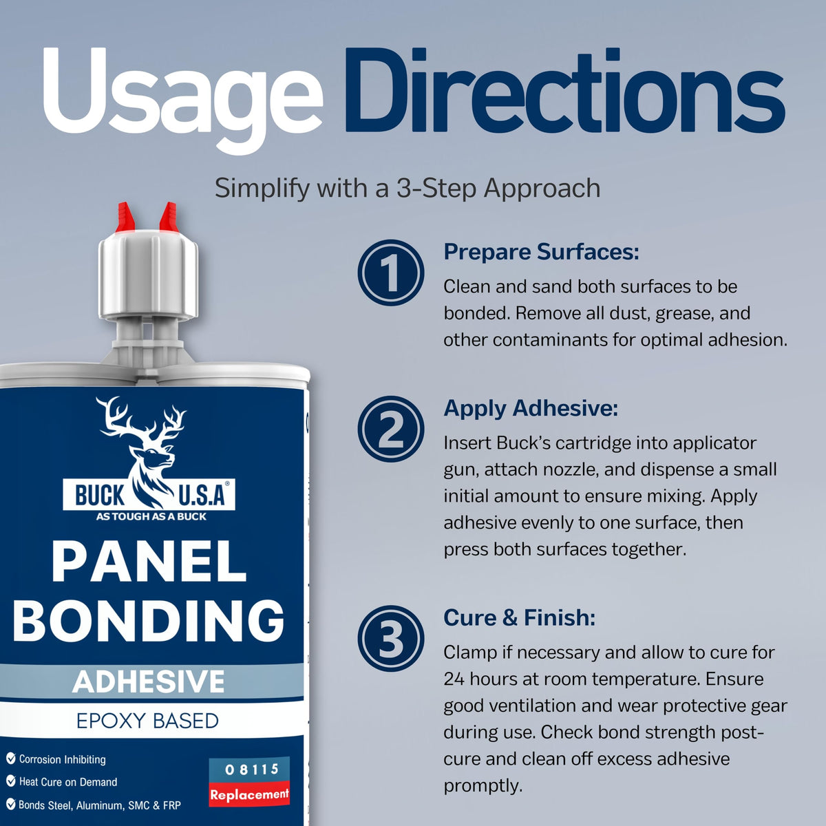 Introducing the Buck Panel Bonding Adhesive, the perfect solution for automotive repairs and metal bonding tasks. This powerful two-part epoxy adhesive delivers exceptional strength and durability, making it ideal for bonding materials like steel, aluminum, plastic, and SMC. Whether you're working on auto body panels, vehicle door skins, or quarter panels, this adhesive meets OEM standards for a reliable, corrosion-resistant, and long-lasting bond. The Buck Panel Bonding Adhesive features a generous 400 ml (13.5 fl oz) cartridge, providing twice the volume of standard products. Included with the adhesive are 3 static mixing nozzles, ensuring a perfect blend every time for strong adhesion. With this larger capacity, you can tackle multiple projects with ease, ensuring better value and fewer interruptions. Its black formulation blends smoothly with most surfaces, offering a professional finish that withstands tough automotive environments. The adhesive is heat-resistant, waterproof, and engineered to perform under extreme conditions, making it suitable for professional mechanics and DIY enthusiasts. Designed as a cost-effective alternative to other high-priced panel bonding adhesives, the Buck Panel Bonding Adhesive offers comparable high performance at a more affordable price. Compatible with standard dispensing tools, it ensures a smooth application with a quick cure time and a 90-minute working time to minimize downtime and maximize productivity. Key features include strong bonding capabilities, high-temperature resistance, and versatility in bonding cold-rolled steel, galvanized steel, ABS, and polypropylene. Whether you're repairing automotive panels or bonding metal components, this adhesive provides a secure, lasting bond. Upgrade your toolkit with the Buck Panel Bonding Adhesive. With double the volume and 3 mixing nozzles included, it's the reliable choice for all your automotive bonding needs.